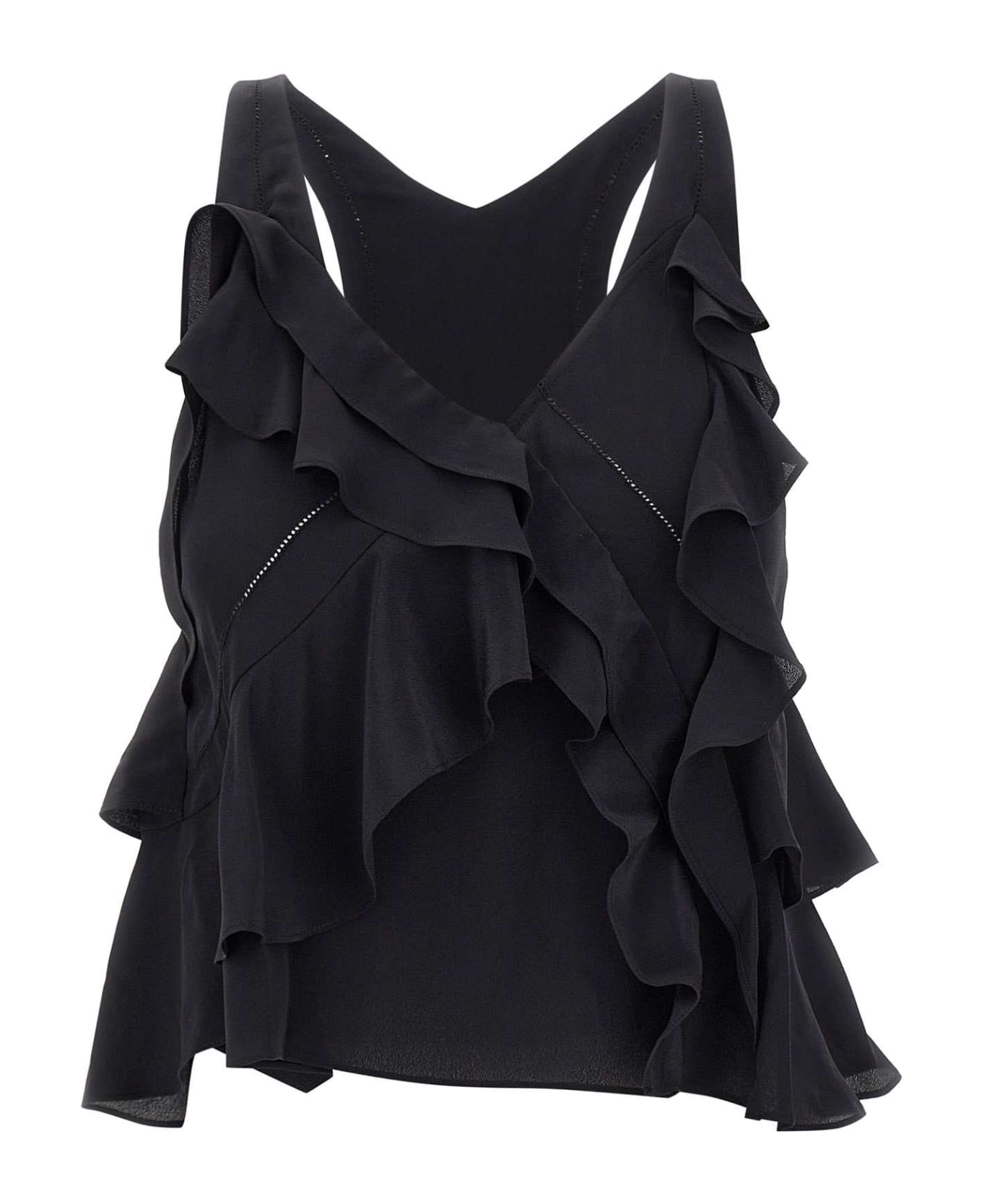 Iro "Ellie" women's silk and viscose top, black, sleeveless, wide armholes, ruffle detail, slightly flared at hem, regular fit. Composition: 60% Viscose, 40% Silk;