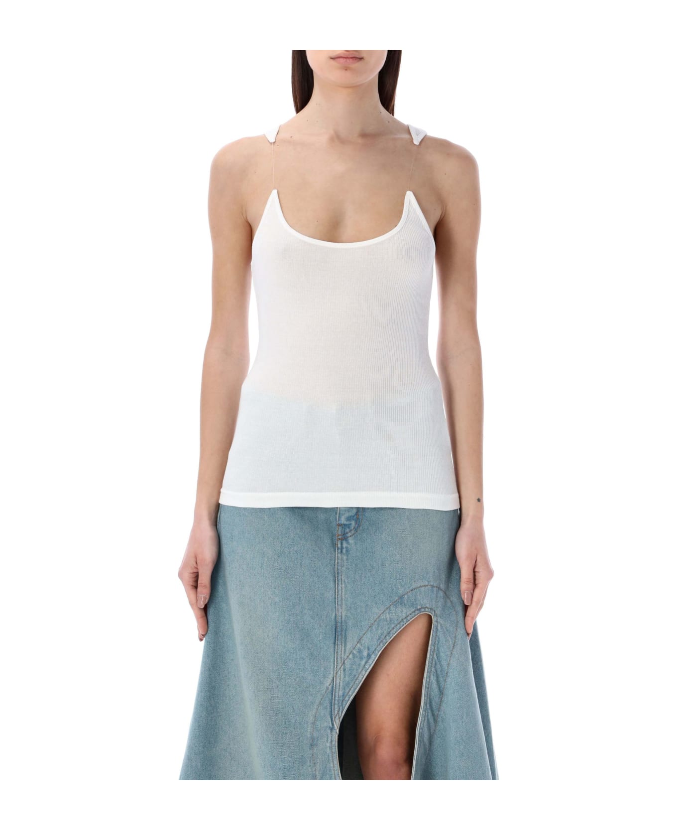 Cotton Invisible Strap Tank Top By Y/project. Featuring: Fitted Invisible Thin Front Straps Floating Effect Rib Knit Racerback Model Is 1,72 M Tall And She Is Wearing Size 36