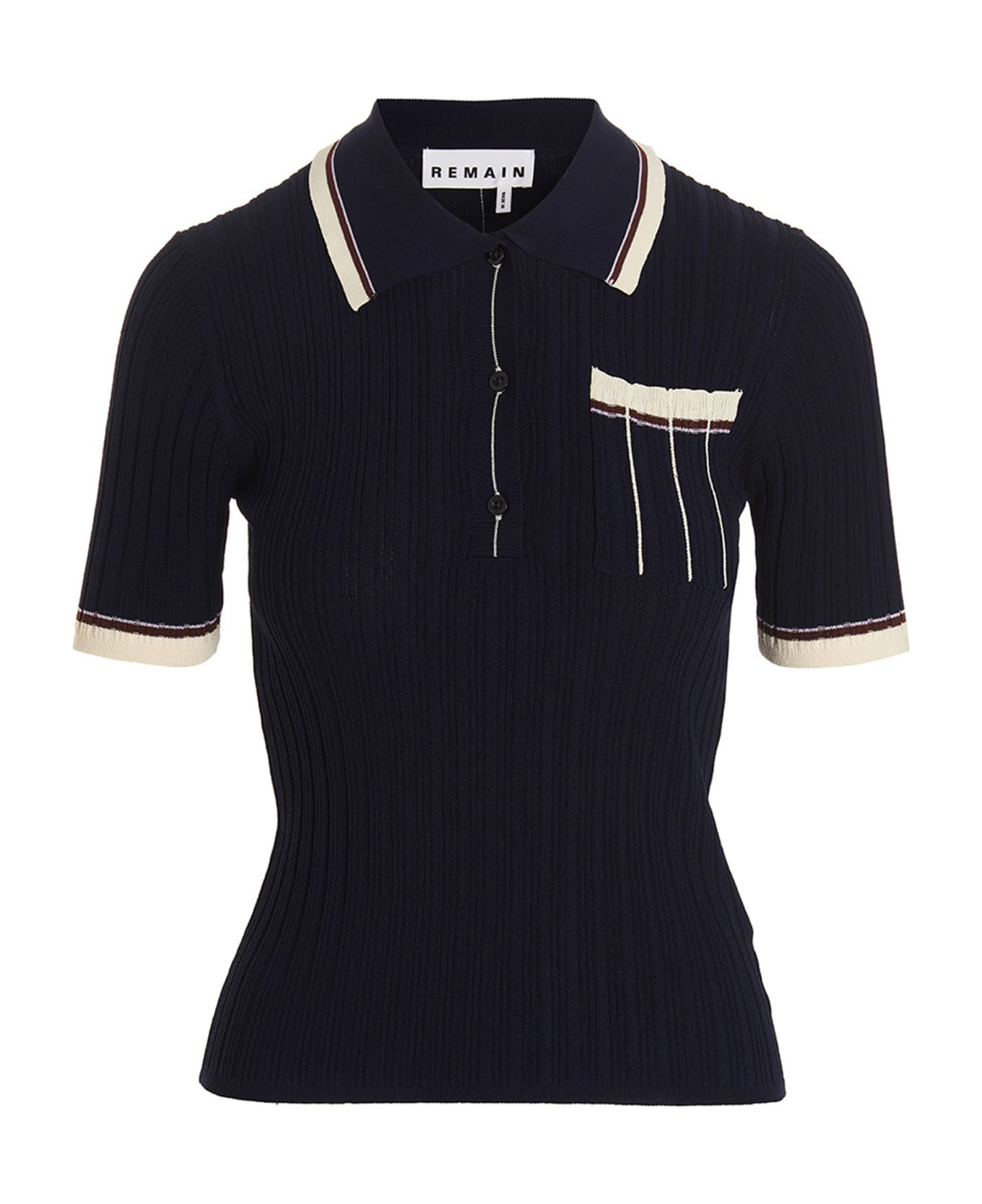 Ribbed viscose knit polo shirt featuring button detail and a chest pocket. Contrast piping.