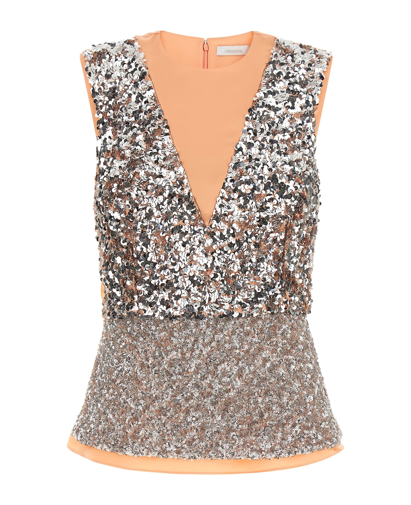 Top in double layer fabric with sequin inserts of different sizes front and back, crewneck, peplos model, back zip closure.