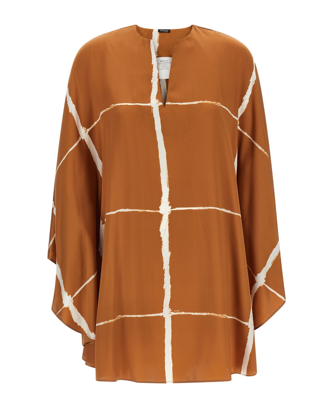 Silk satin blouse with graphic pattern, caftan model, V-neck, wide short sleeves, side slits, rounded hem. Composition: 100% silk