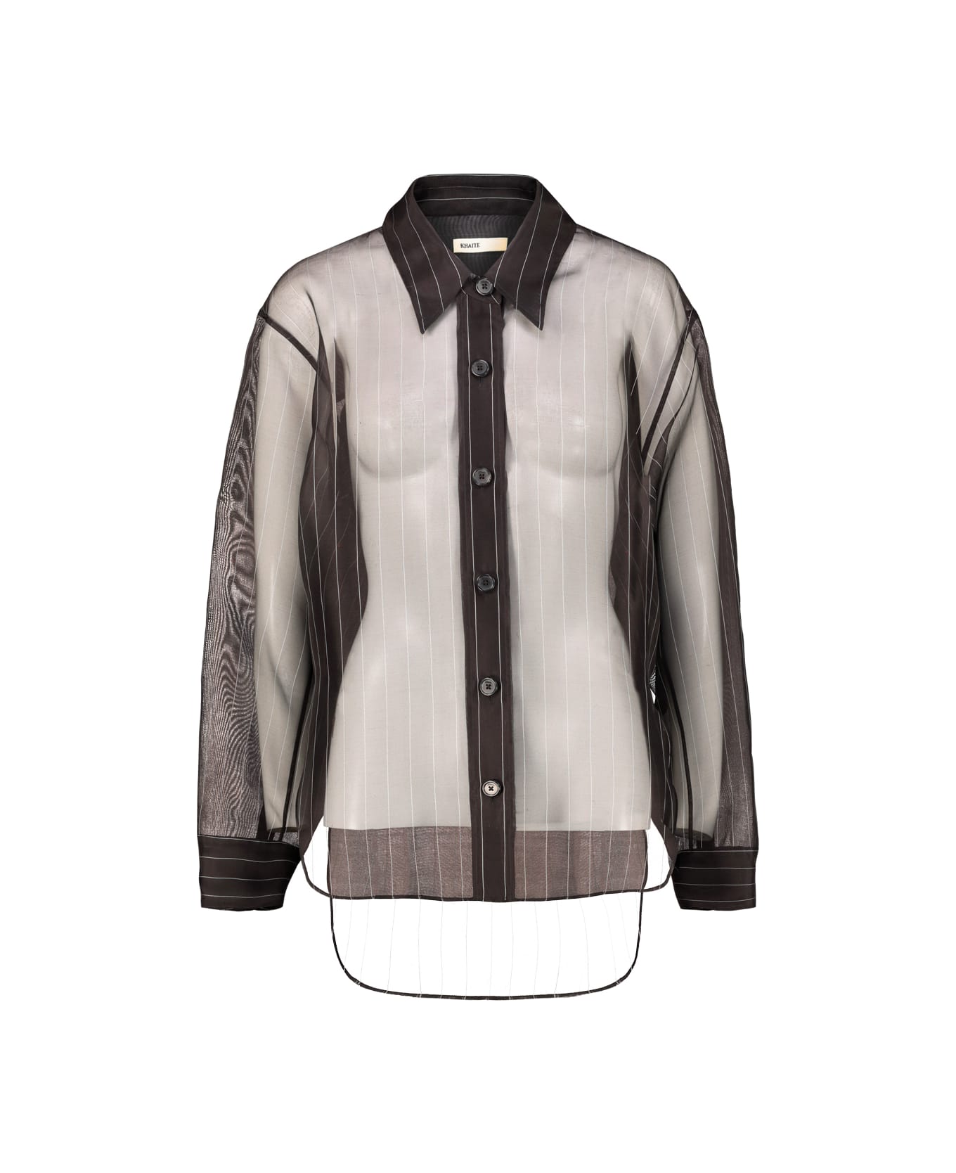 Khaite hershel top in pinstripe organza, relaxed button-up, dropped shoulder seams, back yoke, notched shirttail hem, extended sleeves. GTIN code: 23793000 W3000