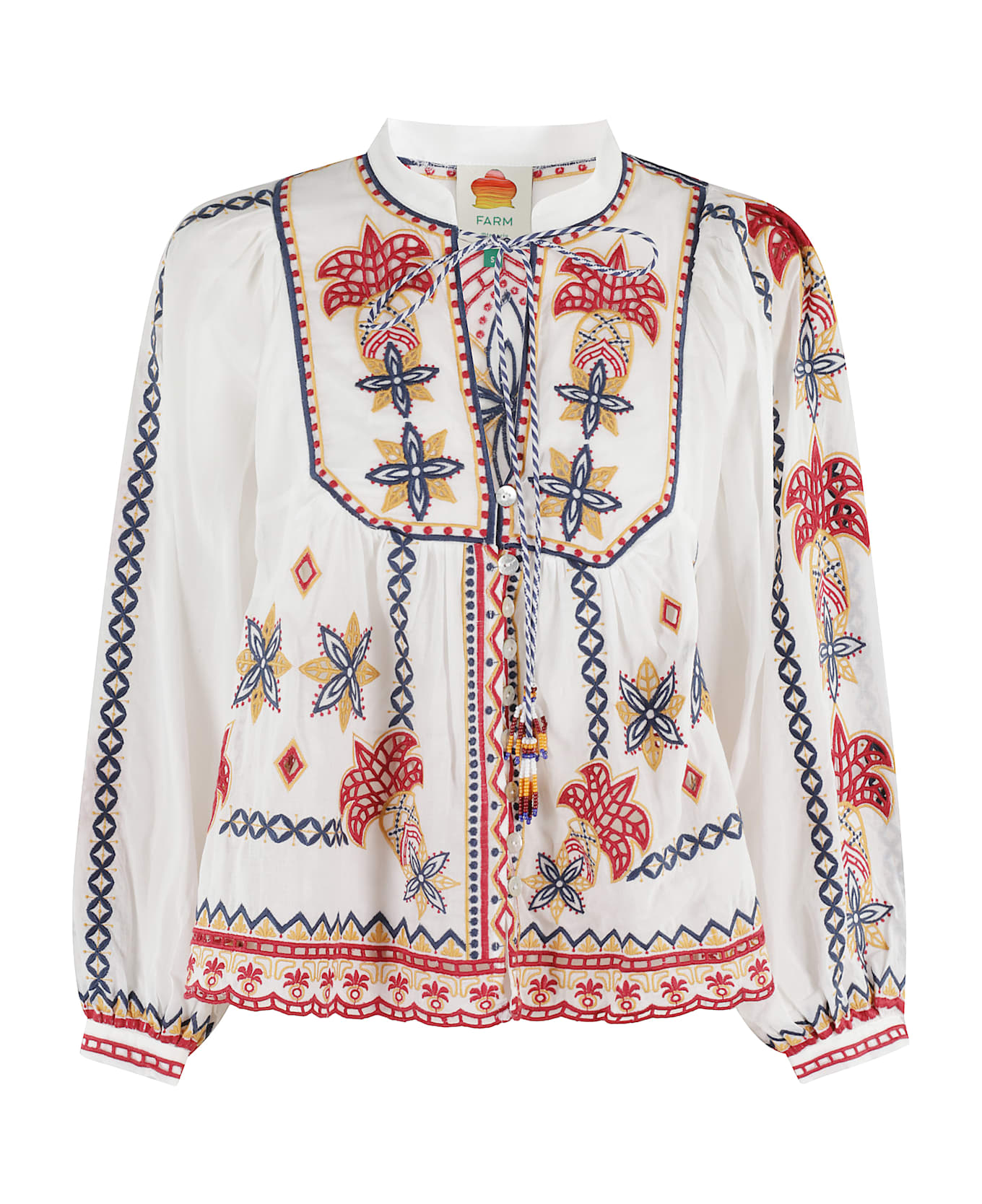 Marys Blouse - Farm Rio - White color - Cotton voile fabric with all-over embroidery - V-neck with drawstring - Long wide sleeve with cuff and button closure - Front button closure - Boxy fit