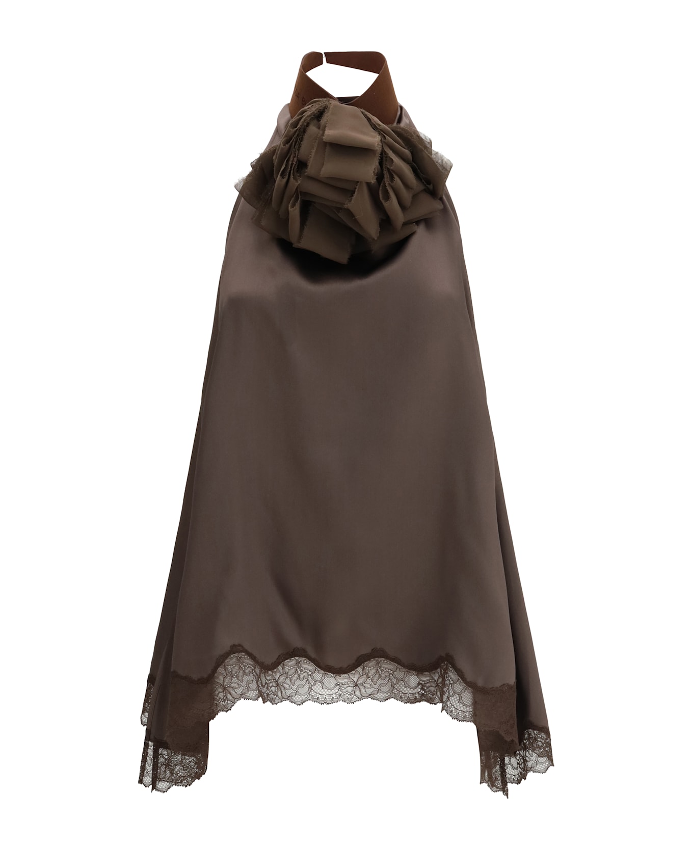 The silk blouse by magda butrym with lace is an elegant and sophisticated garment, characterized by a fluid cut and a refined high neckline, closed at the back with a delicate hook. the open back is tied with long, flowing bands, creating a striking draped effect. finished with side slits and a scalloped lace trim along the hem, this blouse combines sensuality and sophistication. it includes a detachable flower brooch, which adds an extra touch of style and personality to the look. an ideal piece for special occasions or for those who want a refined and unique look.