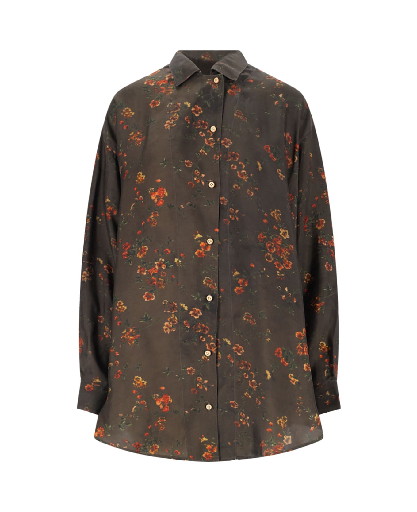 Uma Wang 'Tyesha' shirt in brown fabric with multicolor floral print pattern, classic collar, button closure, button cuffs, curved hem. Composition: 50% Viscose, 50% Cupro