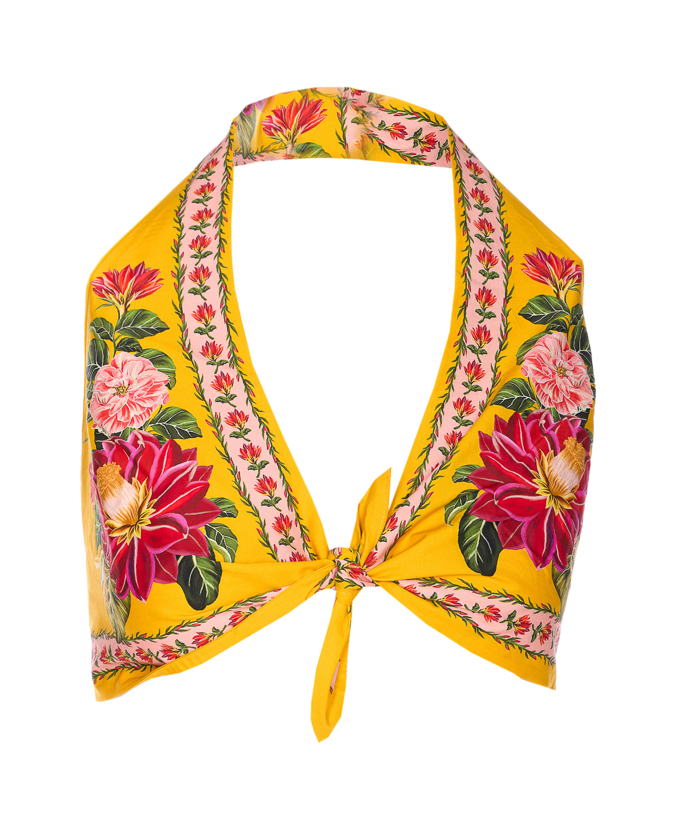 Farm Rio yellow Spring Awakening top, bow closure on the front, printed, crop model