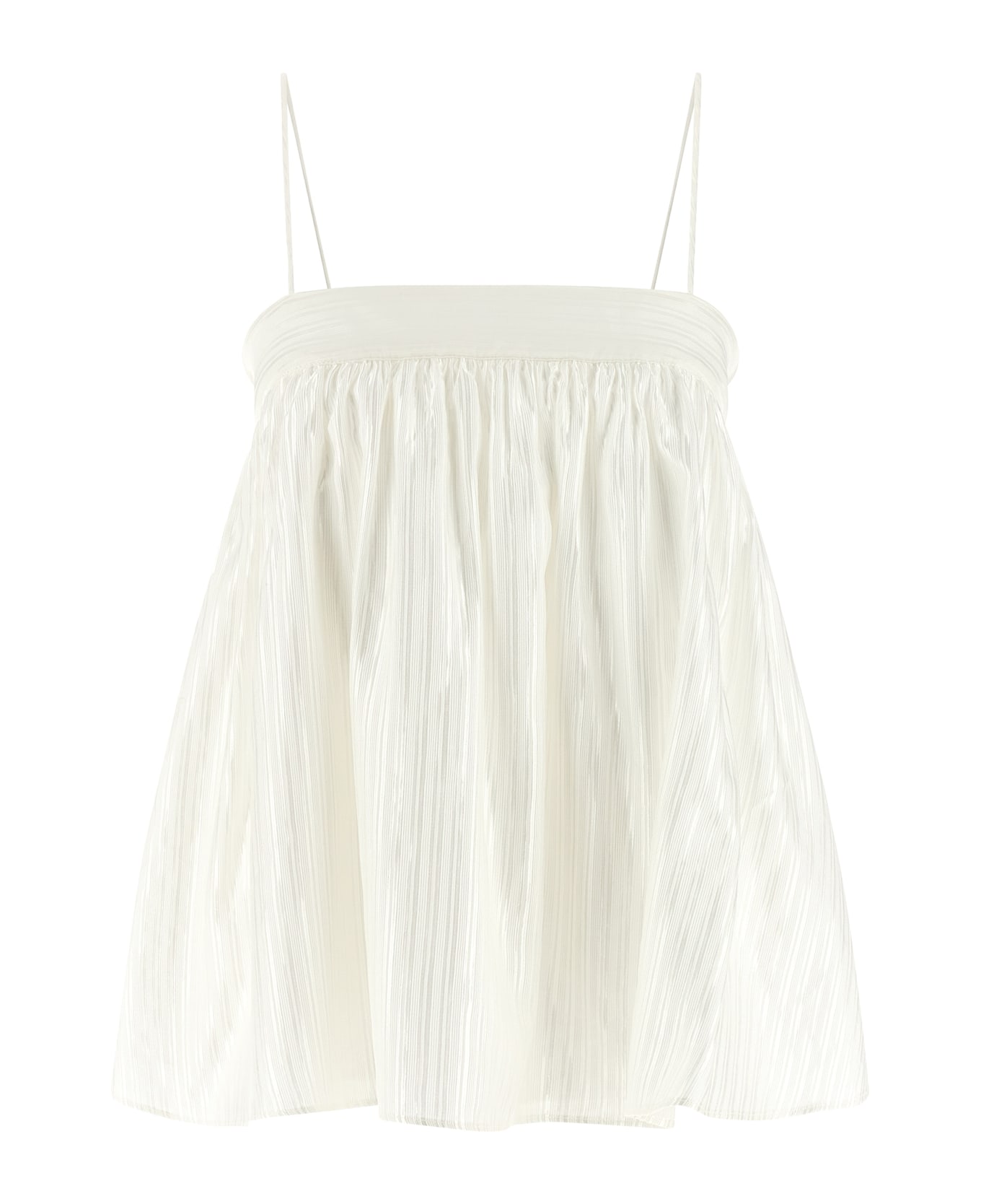 Striped viscose top with glossy finish with curls, A-shaped silhouette, square neckline on the front and back, thin straps, side zip closure, lining.