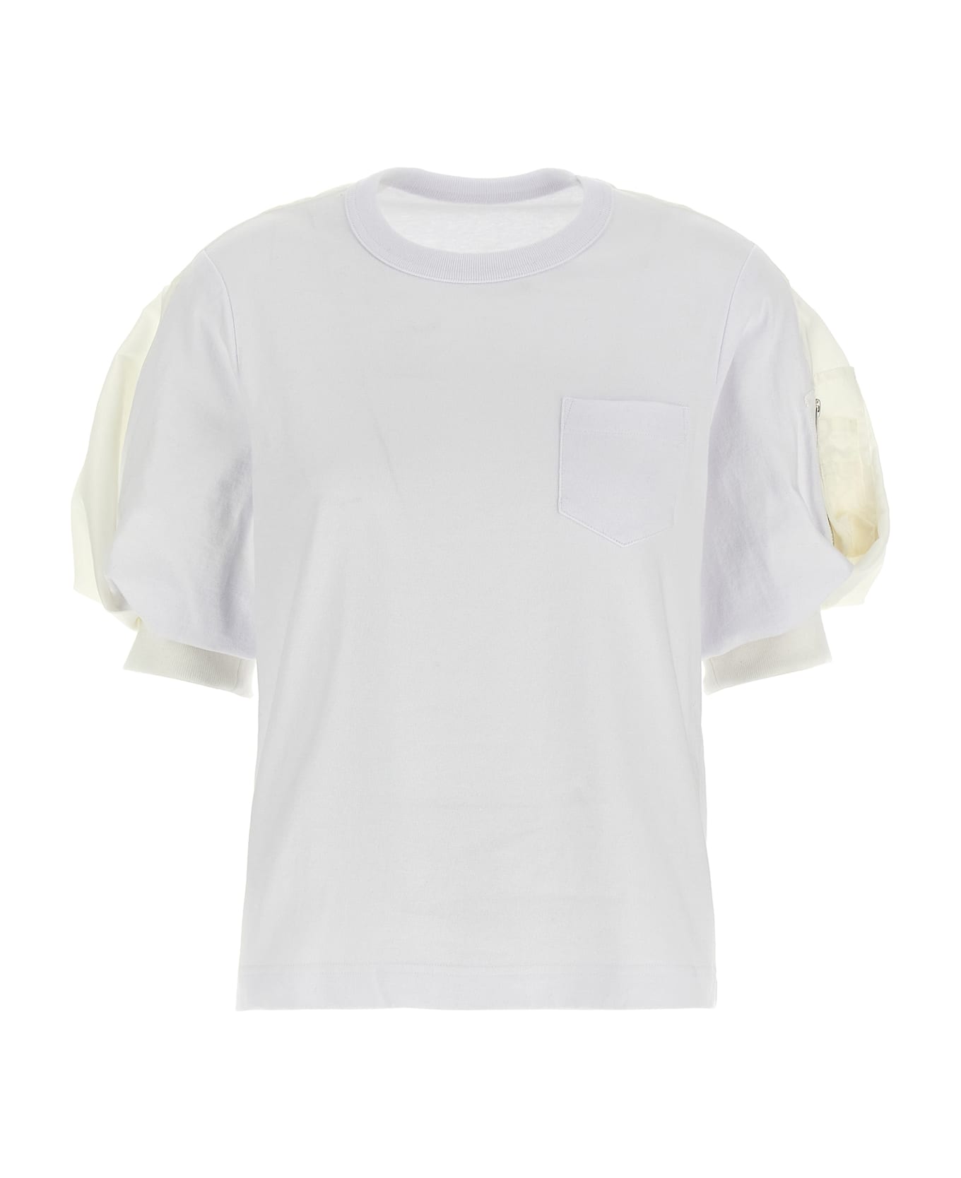Cotton T-shirt with short nylon balloon sleeves and knitted cuffs, crew neck.