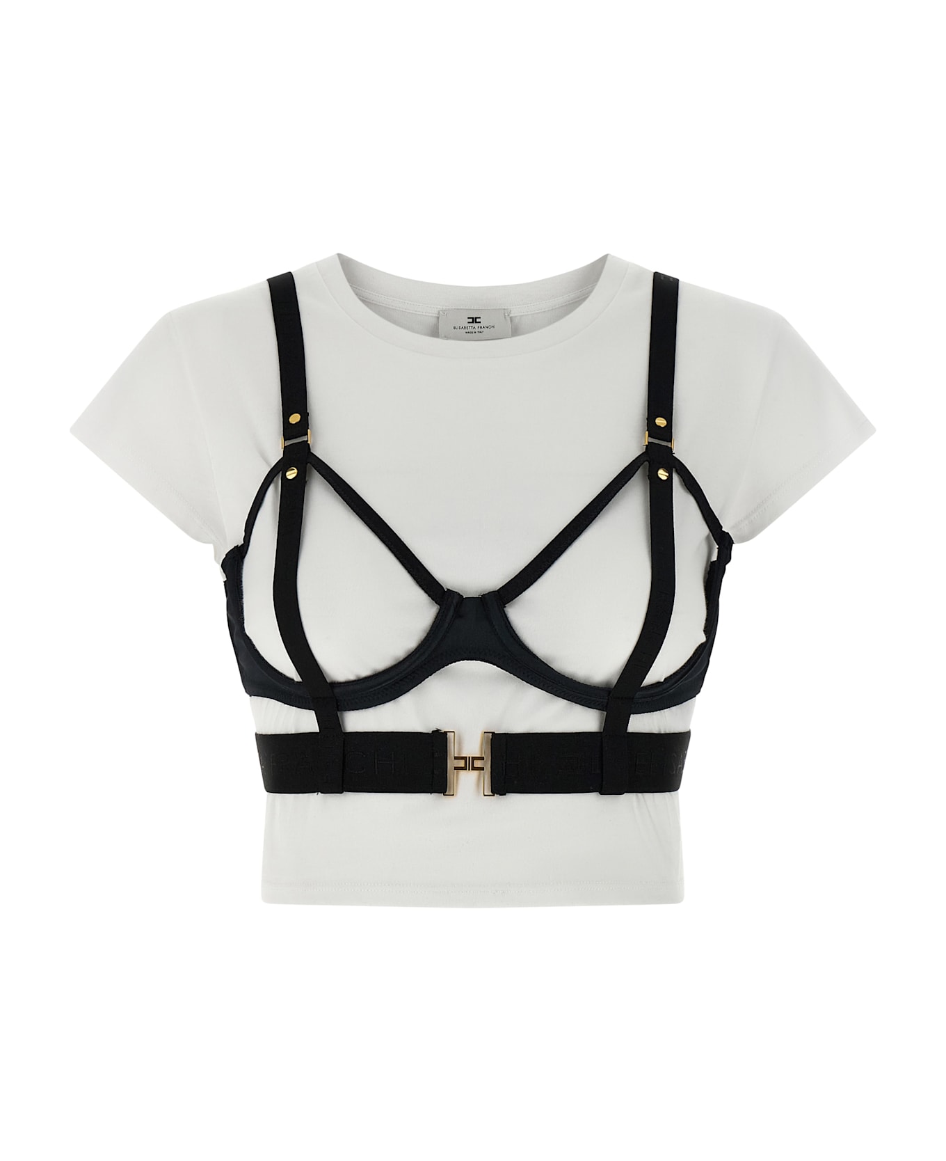 Set consisting of cotton jersey t-shirt, crop model, crew neck, short sleeves and bra, to be superimposed on the t-shirt, in satin and tulle, without cups, adjustable straps, back hook closure, elastic band with logo on the hem with front metal logo and back hook closure.