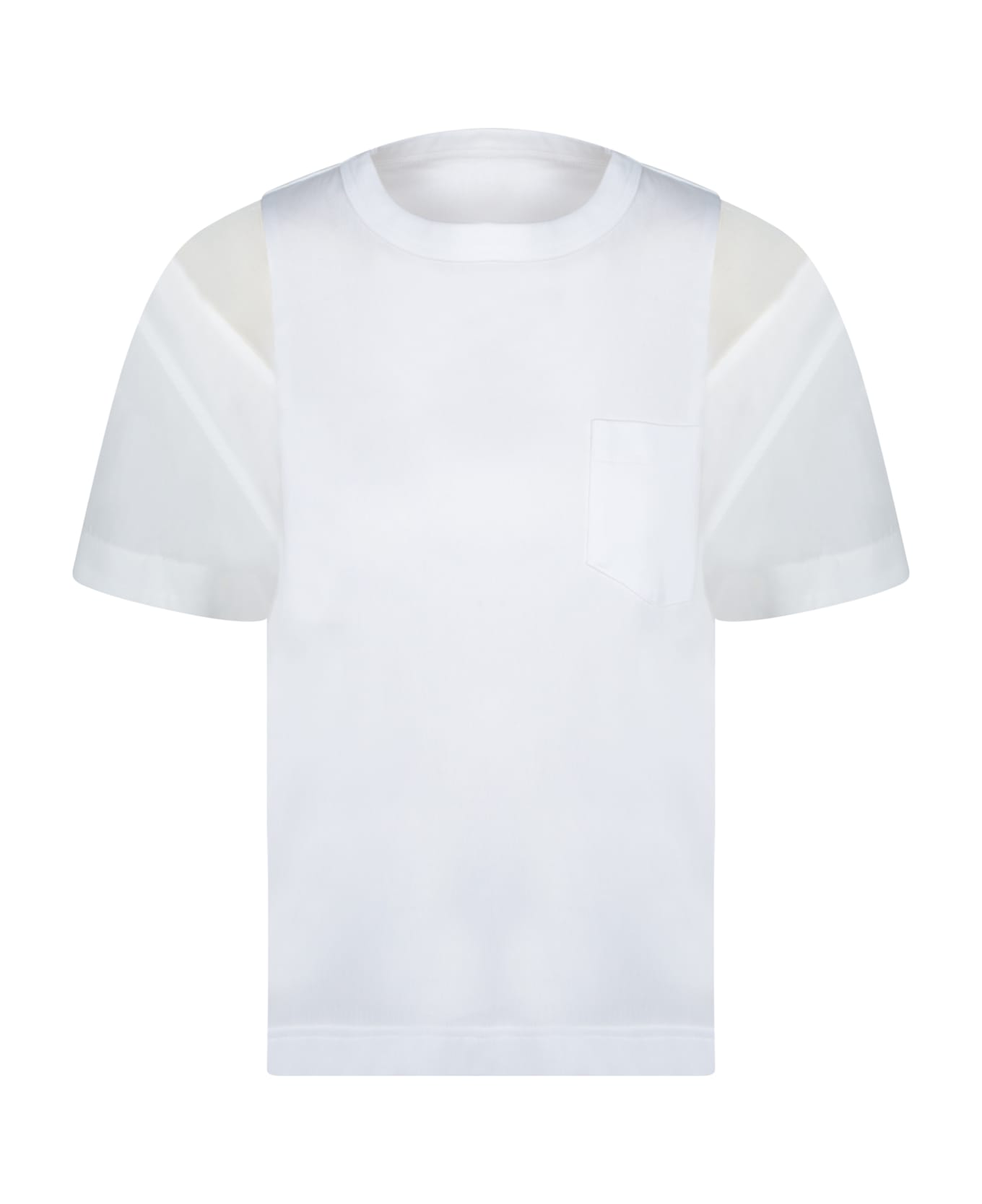 This white SACAI T-shirt blends minimalist style and innovative details with its transparent poplin sleeves and chest pocket. Perfect for a contemporary look.