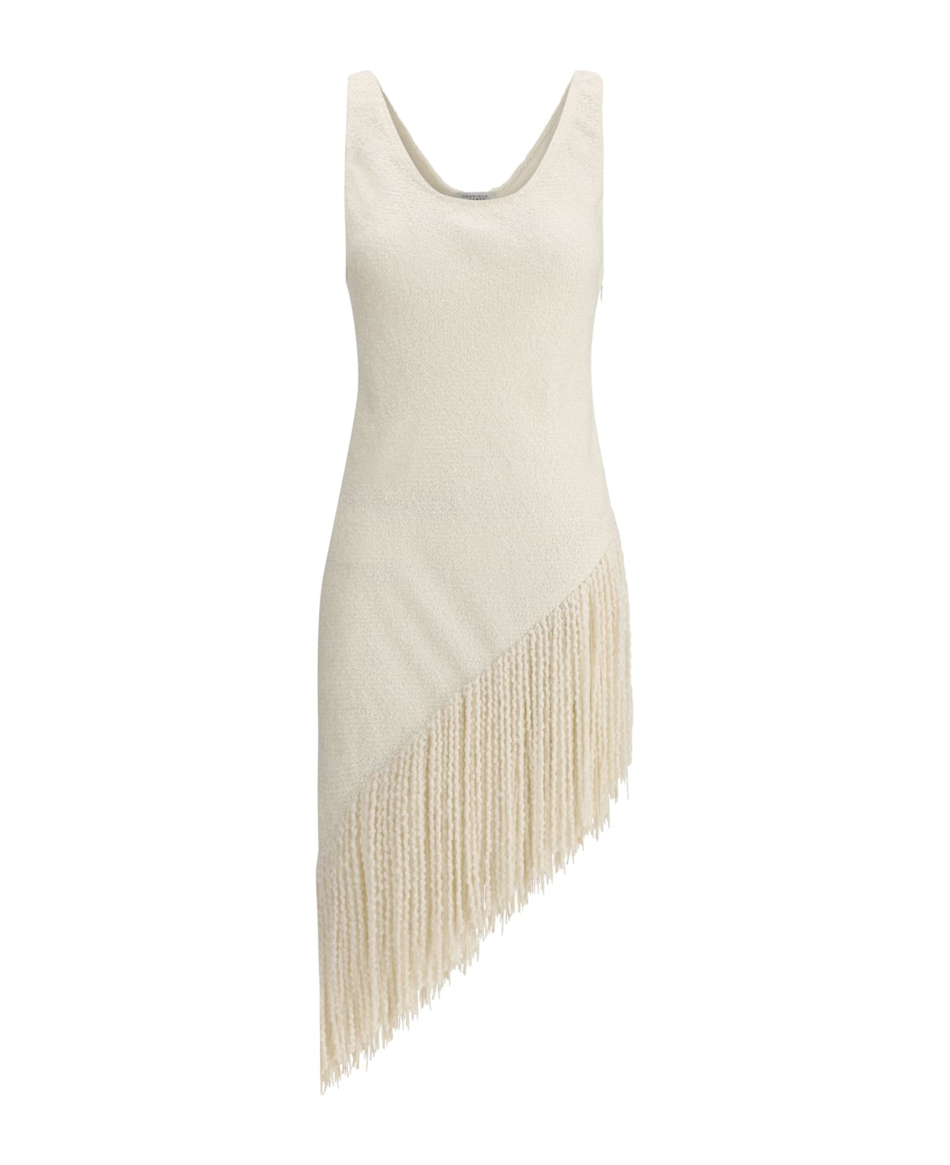 Gabriela hearst's ursin sleeveless top is made of ivory-colored summer silk bouclé. elegant and lightweight, it is embellished with an asymmetrical hand-embroidered fringe in cashmere and silk, a detail that enhances the garment's craftsmanship and refined character.