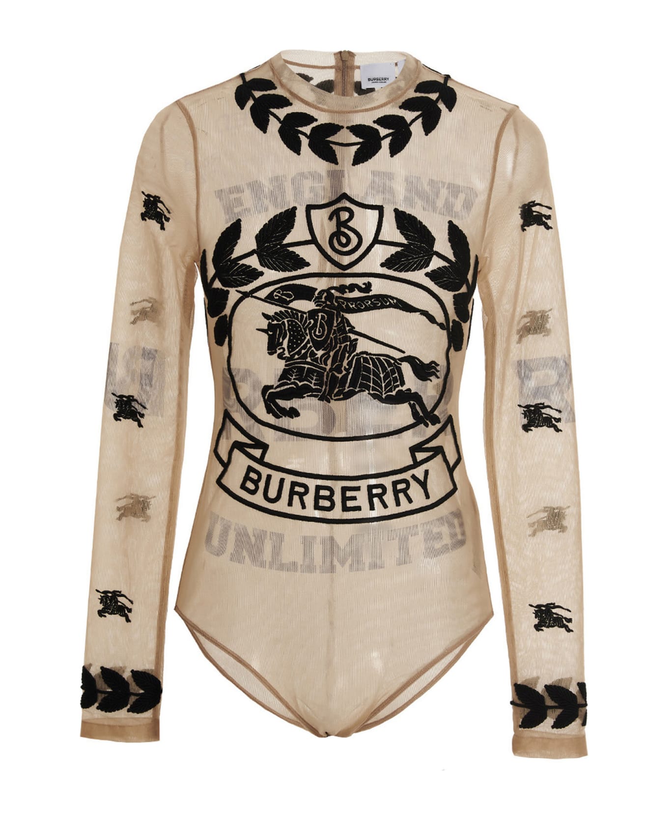 El viscose' stretch transparent tulle bodysuit adorned with prints and embroideries with the horse rider and the emblem with oak leaf, concealed hook, bar and zip closure, snap button closure, crewneck and long sleeves.