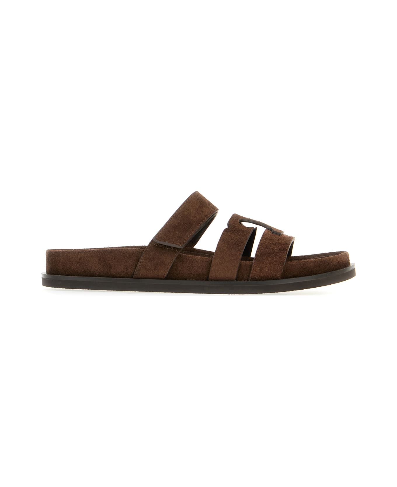 Sandals realized in suede characterized by logoed motif on the instep. - Round toe - Adjustable velcro strap on the instep - Embossed logo on the inside