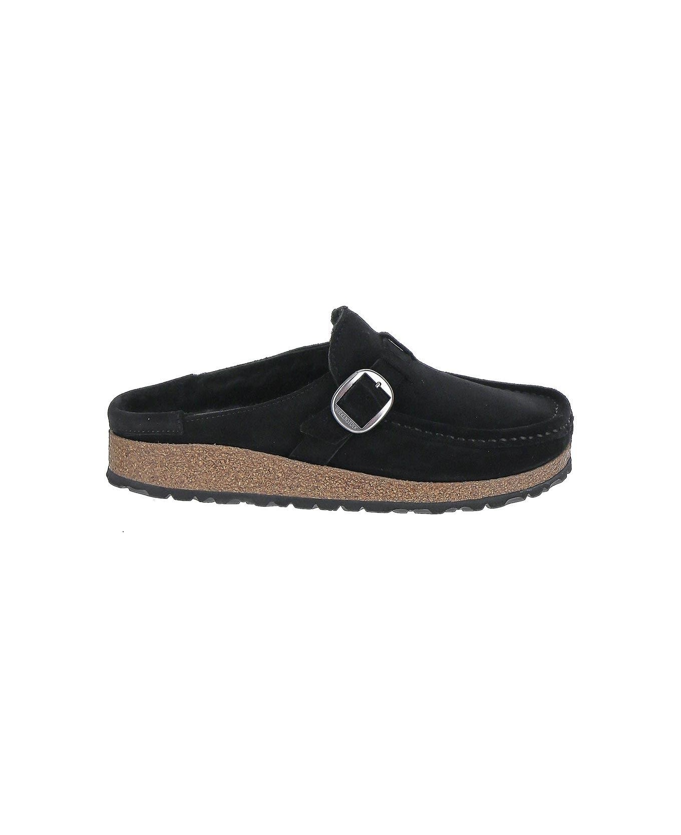 Birkenstock black slides in leather with shearling insert. The item is featured by branded buckle and rubber sole. Composition: PELLE