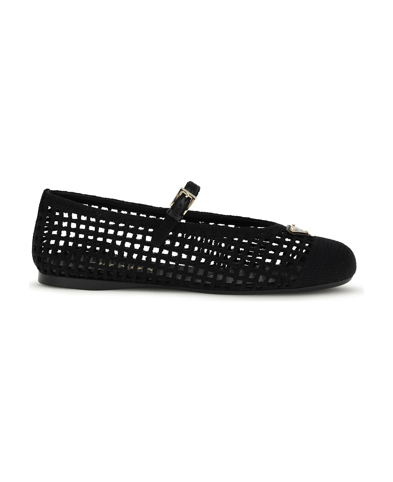 The crochet ballerinas by prada combine handcrafted elegance with distinctive details. the upper, embellished with logo-embossed metal buckle, is complemented by the enameled metal triangle logo, the brand's iconic symbol. the 0. 5-mm one-piece rubber sole with branded logo ensures comfort and a touch of refined style. Composition: 95% % Cotton, 5% % Polyester