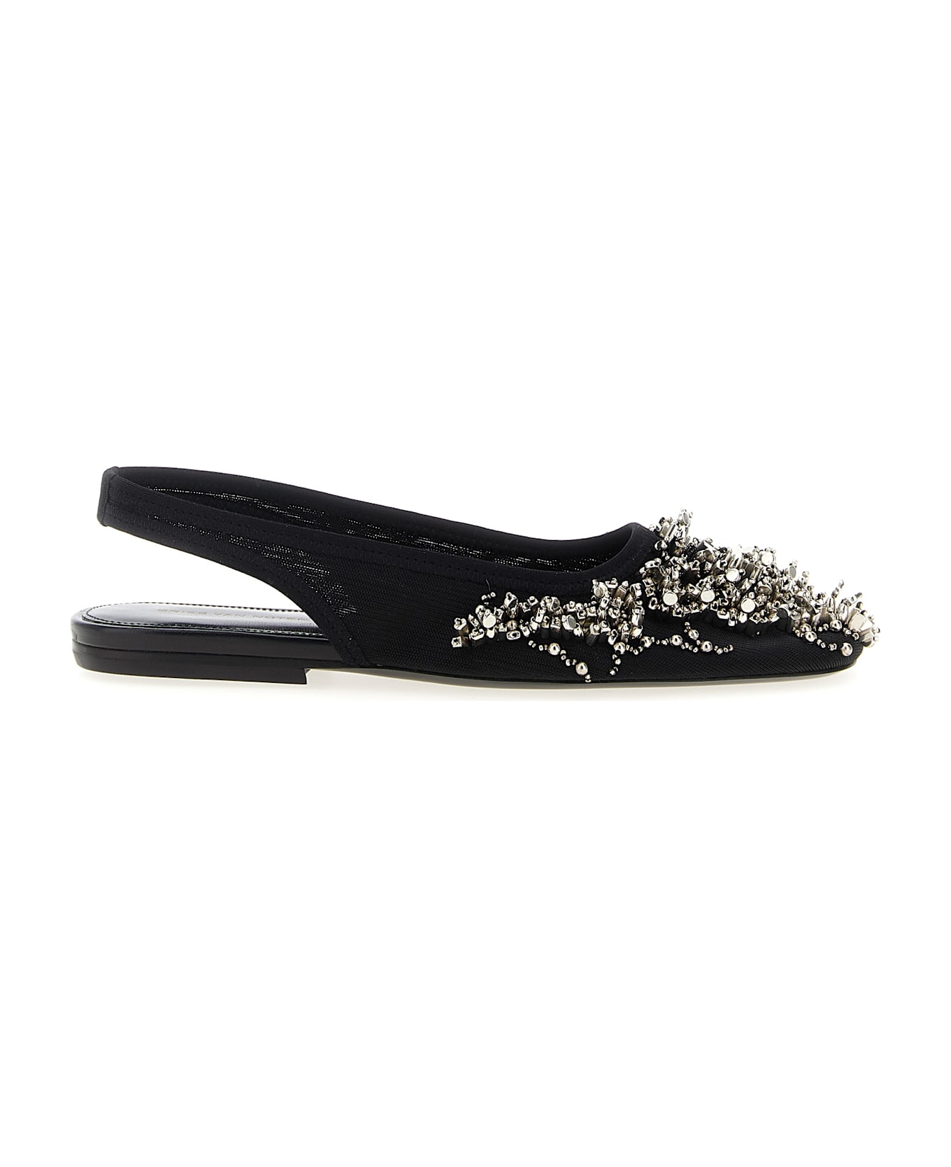 'Embroidered' nylon slingbacks with embroidered beads and applied electroformed form elements, leather sole, leather sole.
