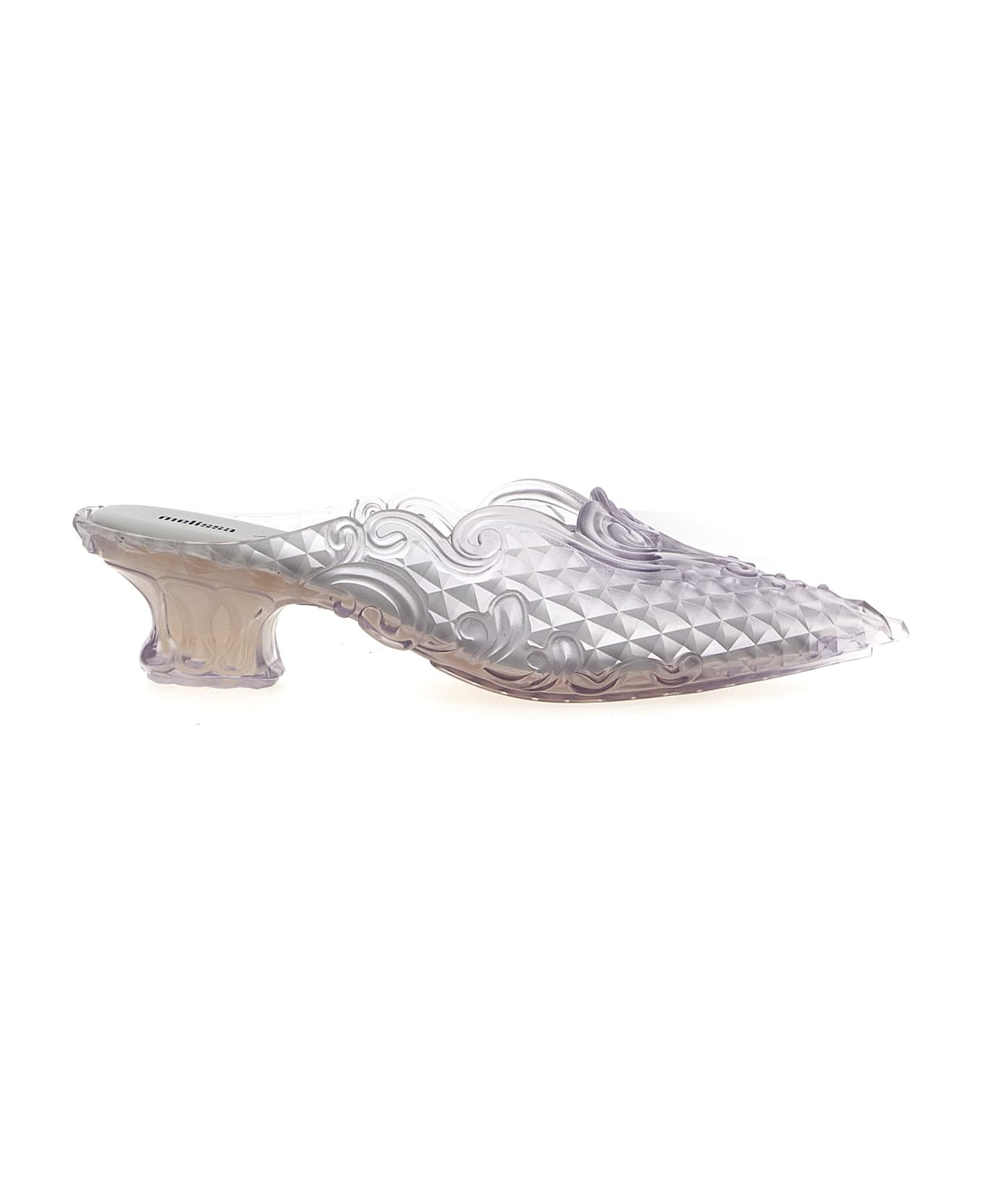 Y/Project x Melissa 'Court' mules in transparent textured plastic material, pointed model and shaped low heel.