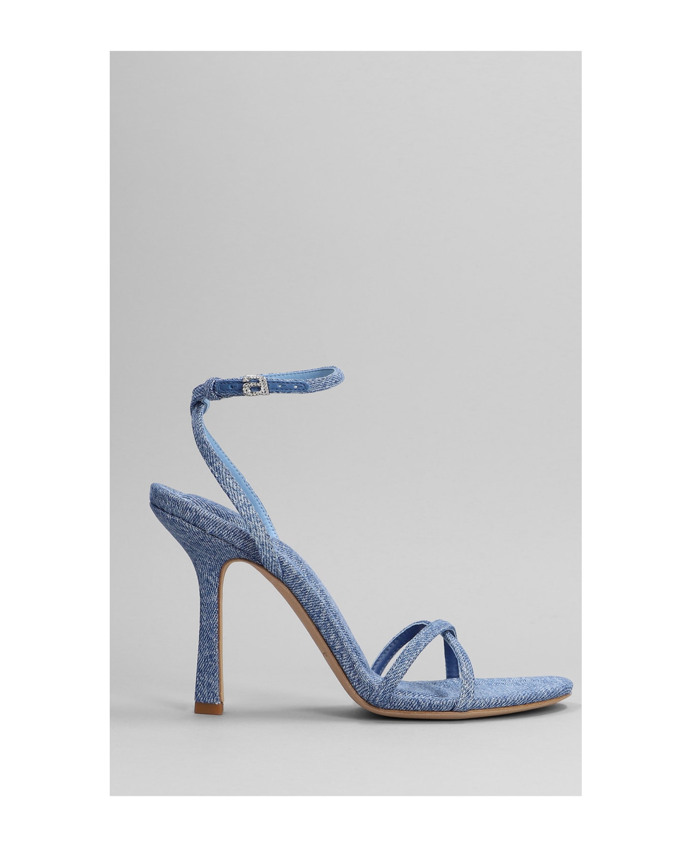 Dahlia 105 Sandals in cyan denim, cross straps, ankle strap, heel 115mm, leather sole, Made in China, 100% canvas