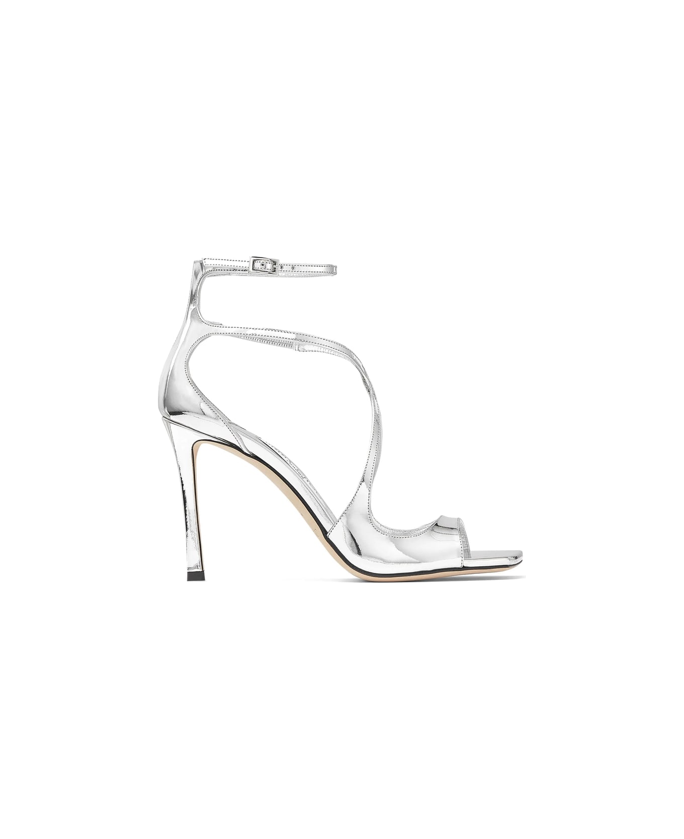 silver-tone leather patent finish metallic effect square open toe multi-way straps buckle-fastening ankle strap branded leather insole 95mm high stiletto heel leather outsole Wardrobe Icon