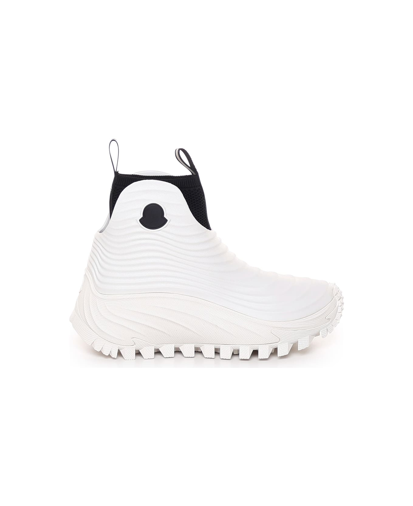 White Acqua High Rain Boots Moncler Genius X Alicia Keys from Moncler -Recycled waterproof EVA upper -Recycled knit and vulcanized rubber lining -Recycled rubber sole -Upper height 13 cm -Colour: White -100% Vinyl