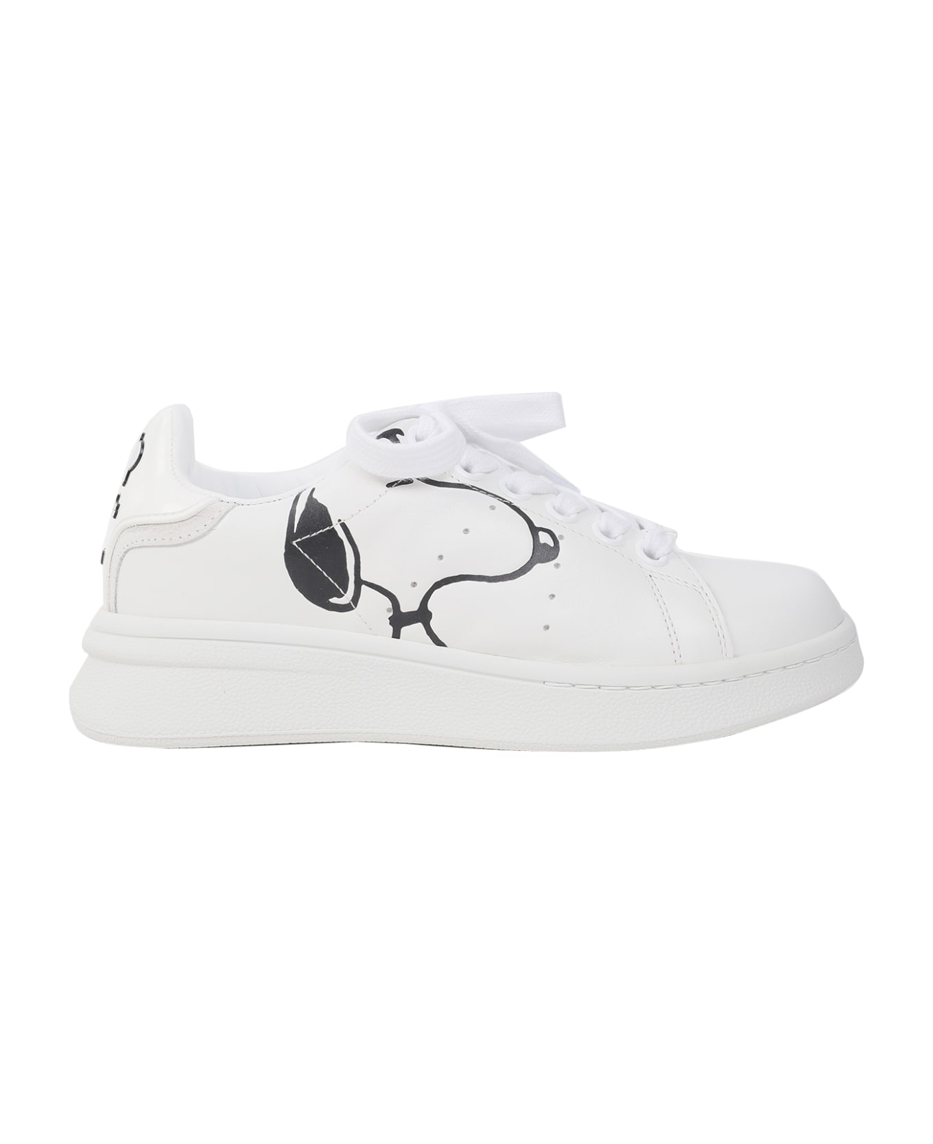 White leather lo-top sneakers. Snoopy print on the side. Lace-up fastening. Tonal laces. Snoopy lace detail. Round toe. Perforated details. White 3D tennis detail at back. White 3. 5 cm rubber sole. 100% calf leather Made in Portugal Designer colour: WHITE