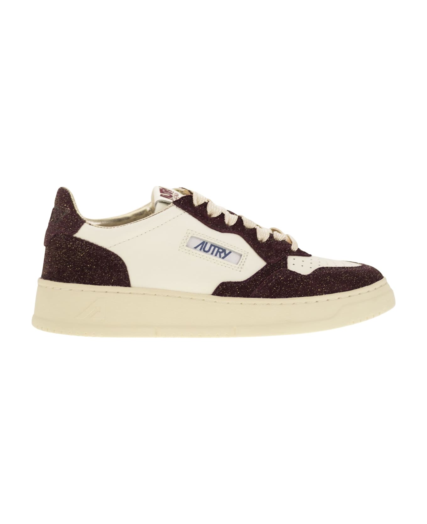 A timeless style: Autry Medalist is the shoe inspired by the vintage models of the 1980s, reinterpreted in a contemporary key. An unmistakable design made unique by the two-tone leather and glitter upper and the iconic logo embossed on the back heel. - Perforated toe to aid breathability - Flat cotton laces - Leather tongue with foam padding and matching stitched label - Padded collar with contrasting inner part - Leather and cotton terry lining - Two-tone branded rubber sole DESIGNER ID: AULWTA05