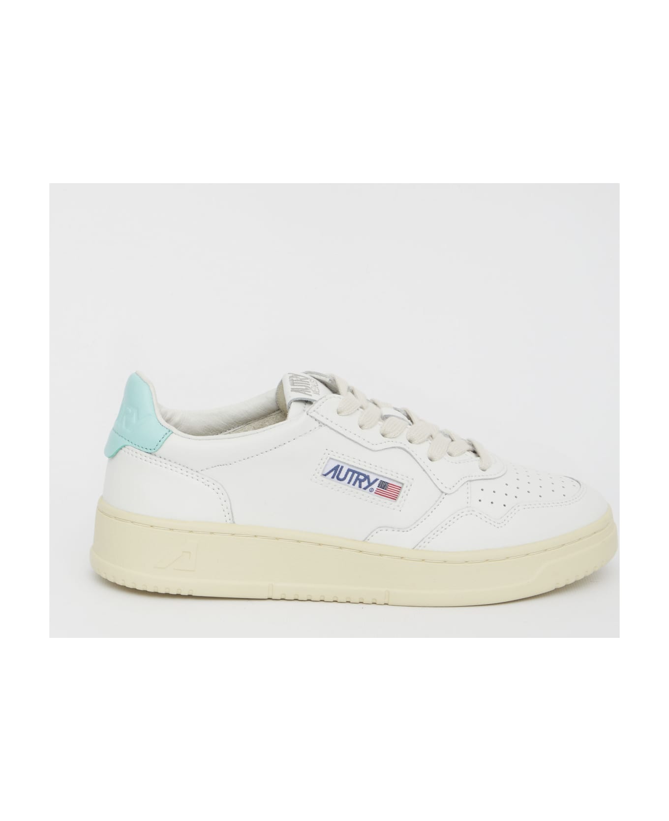 Low-top Medalist sneakers in white leather with turquoise heel and rubber sole. They feature lace-up closure, perforated toe, side detail with Autry blue logo, logo on tongue and embossed logo on the back.
