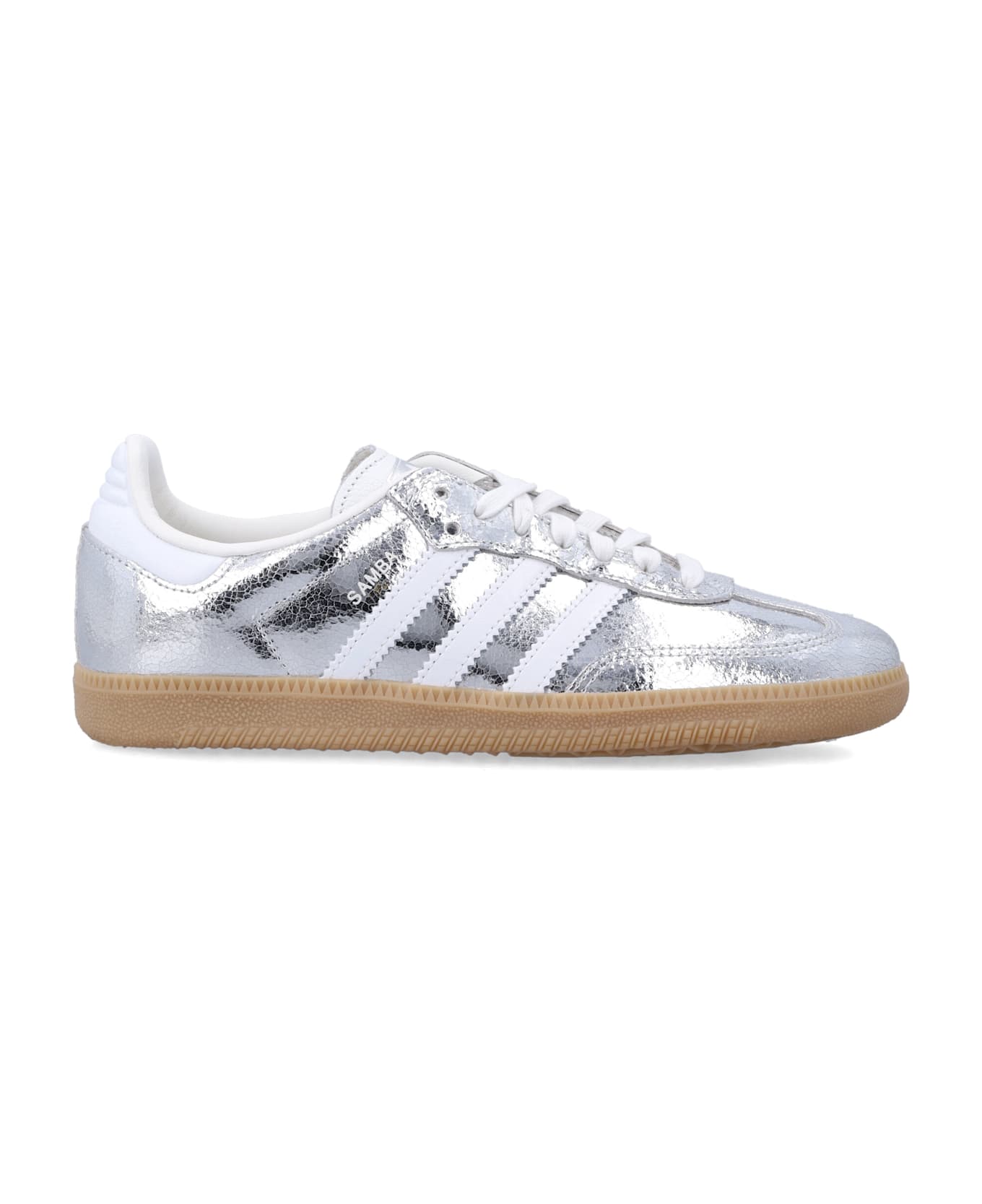 The Adidas Samba Sneakers Are Reimagined With A Metallic Silver Finish That Enhances The Brand s Iconic Heritage Silhouette. The Crackled-effect Upper Subtly Reflects Light, While The White Three Stripes And Natural Rubber Sole Preserve The Shoe s Authentic Character. A Versatile Style Designed To Add A Modern Edge To Everyday Looks. Metallic-effect Synthetic Upper Iconic Adidas Samba Design Lace-up Fastening Contrasting Three Side Stripes Natural Rubber Sole Reinforced Toe