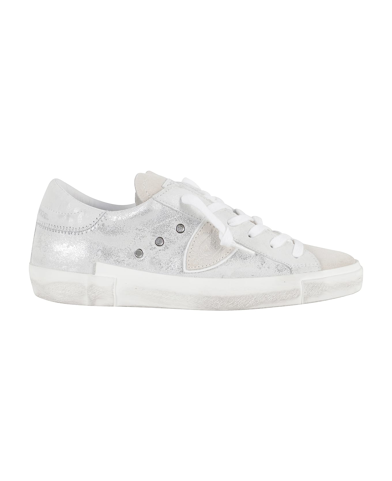 PRSX Low sneakers - Philippe Model - Silver color - Metallic leather upper - Round suede toe - Contrasting heel - Embossed side logo - Lace-up closure - Rubber sole.