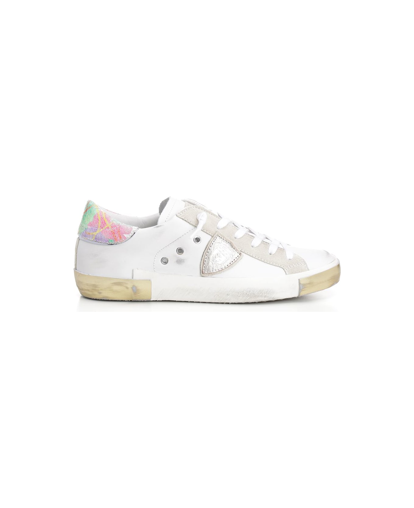 Low-top "Prsx" sneakers in white leather by Philippe Model with coloured heel tab and silver leather side shield.