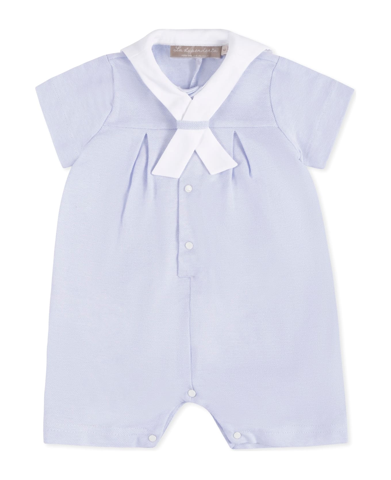 Light blue cotton pique romper, short sleeves, with sailor collar and snap button fastening on the front and between the legs.