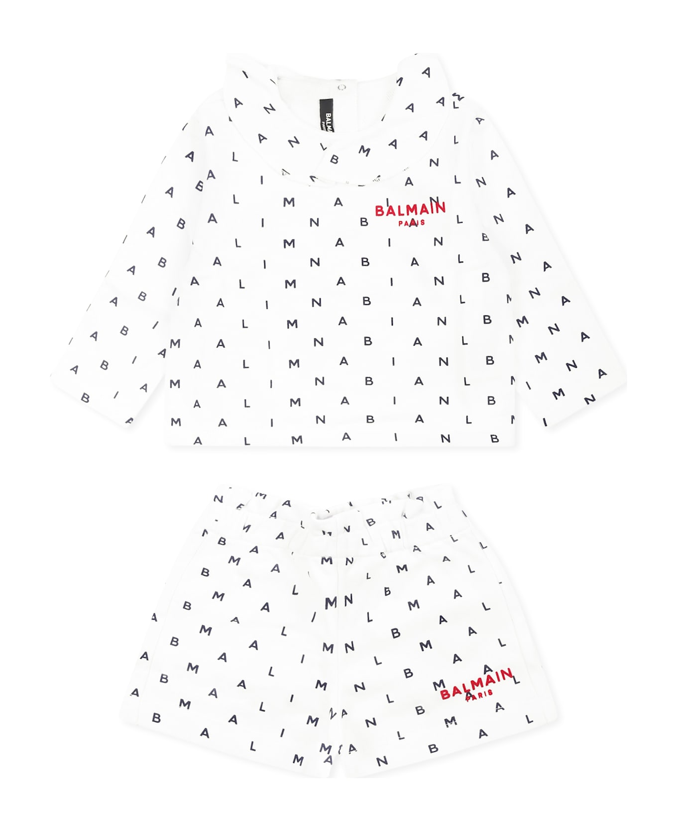 White suit in brushed organic cotton, consisting of sweatshirt and shorts. Long-sleeved sweatshirt, with a ruffled crew neck and snap button fastening on the back; shorts with an elasticated waist. It is embellished with all-over contrasting logo and red logo on the front.