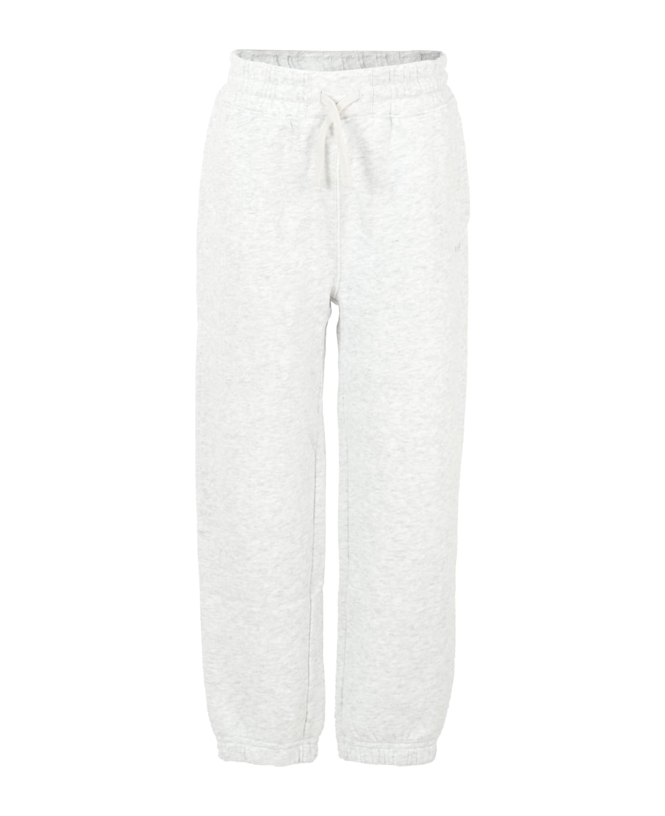 Melange grey cotton blend trousers, with an elasticated drawstring waist, side pockets, and elasticated cuffs. They are embellished with an embroidered logo on one leg.