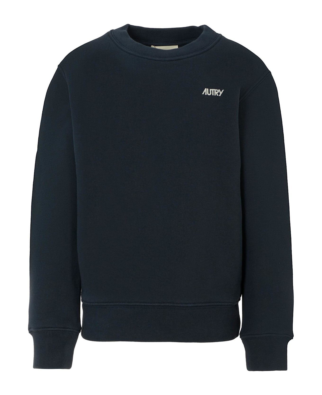 Blue sweatshirt in fleece cotton, long sleeves, with ribbed crew neck, cuffs and hem. It is embellished with an embroidered logo on the chest.