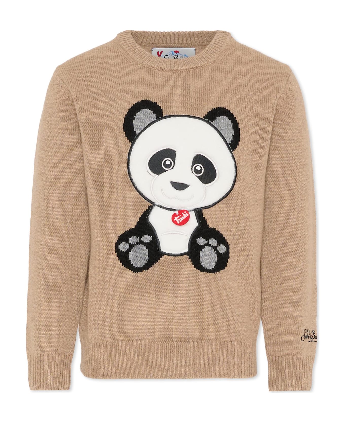 Brown sweater with long sleeves, a crew neck, and ribbed hem and cuffs. Size 2 years features a practical button closure at the shoulder. It is embellished with panda on the front and embroidered logo on the sleeve. Made in collaboration with Trudi.