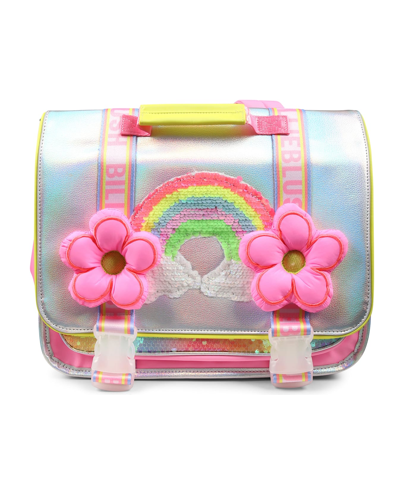 Iridescent multicolor backpack with sequins, handle, front flap with snap buckles, padded and adjustable shoulder straps, padded back and tag. It is embellished with rainbow of sequins and padded flowers applied on the front.