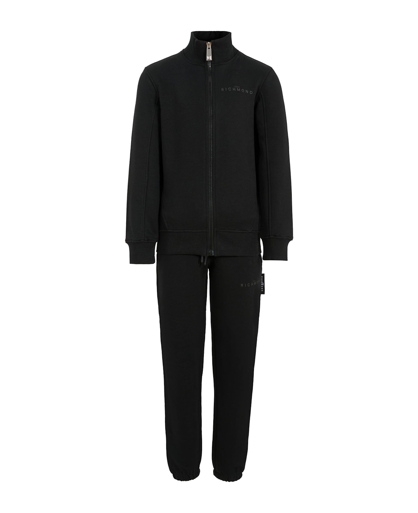 Black suit in brushed cotton blend, consisting of a sweatshirt and trousers. Long-sleeved sweatshirt, with a high neck, front zip fastening, ribbed cuffs and hem; it is embellished with a black rubberised logo on the chest. Trousers with an elasticated waist, drawstring, side pockets and elasticated ankles; they are embellished with a logo on one leg.