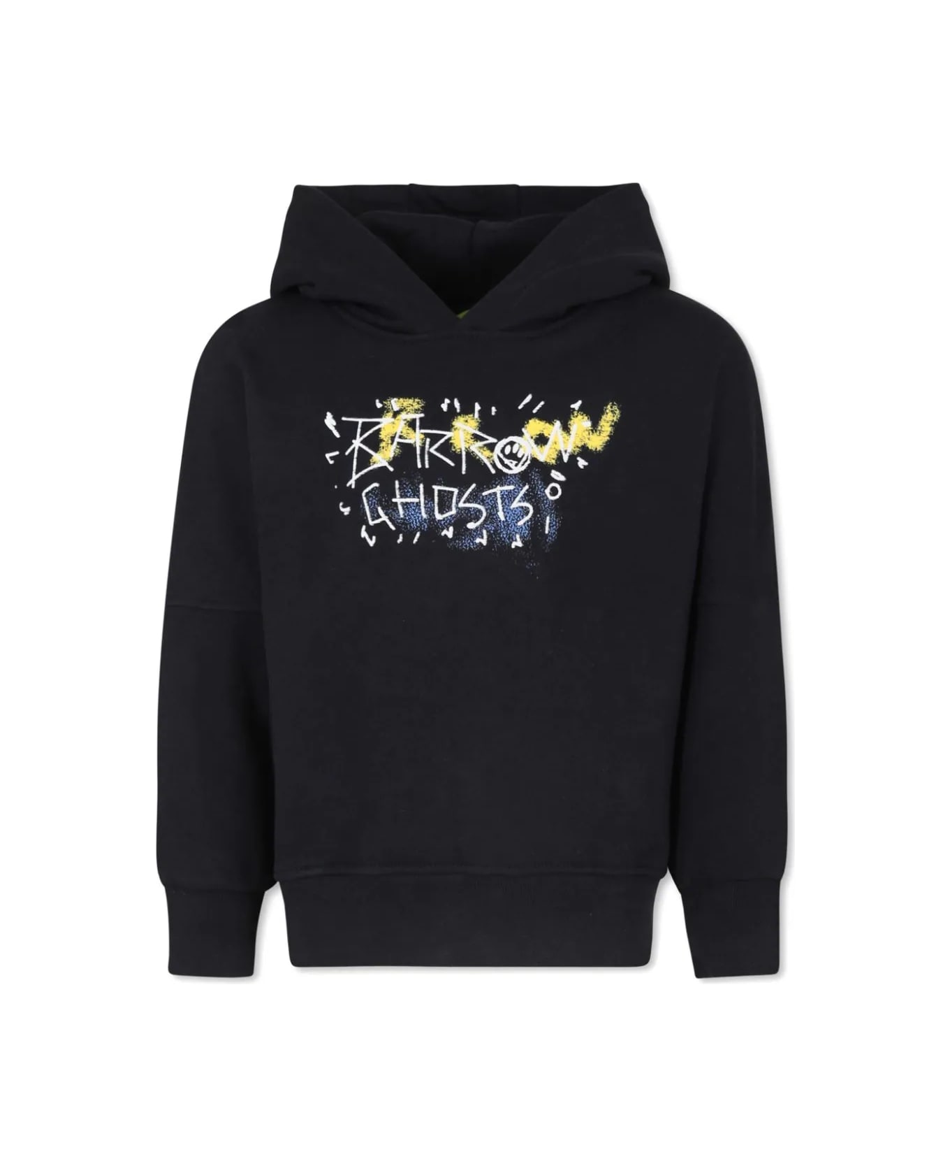 black/multicolored in cotton, graphic print on the back, print on the front, long sleeves, with hood, ribbed hem and cuffs. 100% cotton