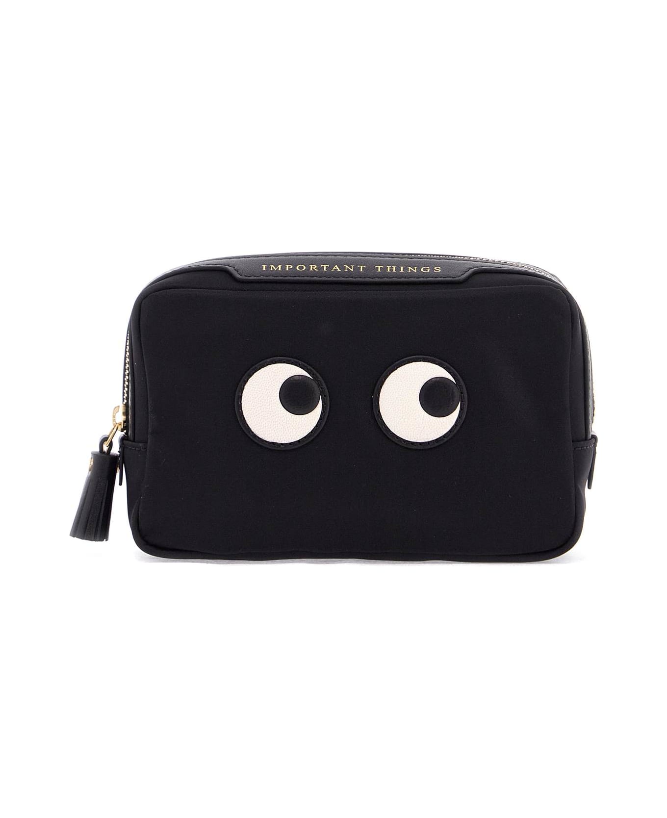 The Anya Hindmarch Pouch is made from regenerated ECONYL® nylon, designed to carry important items as suggested by its name. It is adorned with the iconic leather Eyes patches on the front. The top closure features a zip and tassel, while the interior is lined with branded fabric and includes a zip pocket. The metal hardware has a gold finish.