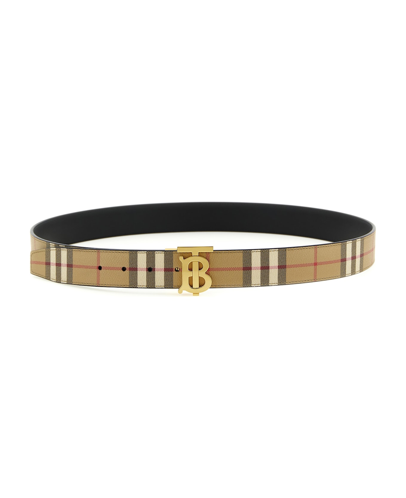 Solid color smooth leather reversible belt with Burberry Check print, gold-plated metal buckle with 'TB' monogram. Composition: 55% polyurethane 25% polyester 20% cotton