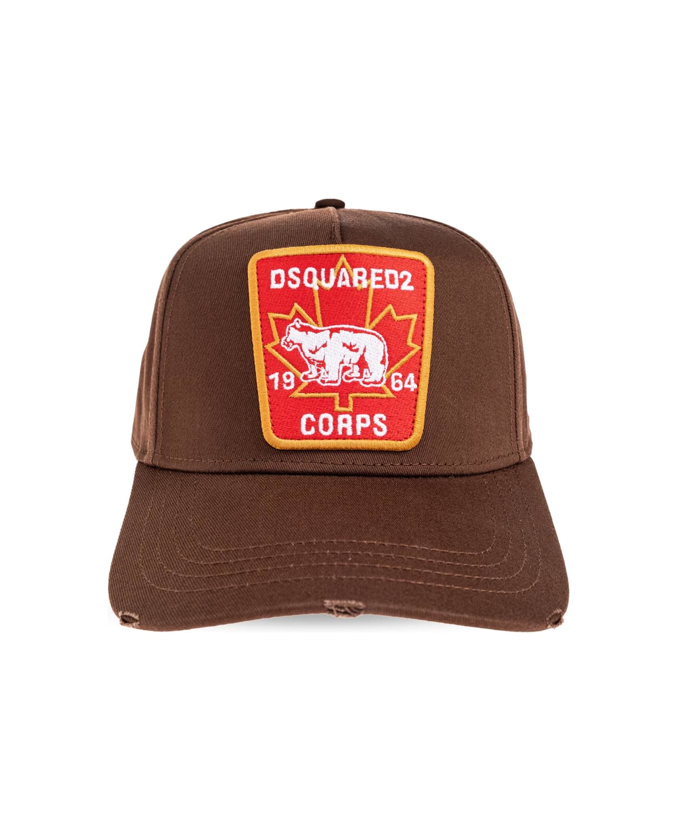 Immerse yourself in contemporary sophistication with this brown baseball cap from the exclusive DSQUARED2 collection. This refined piece features a classic six-panel construction and a gracefully curved brim, meticulously shaped for timeless allure. The front boasts an ornate embroidered patch, with a vibrant red shield inset, yellow trim, and striking accents of a maple leaf and bear silhouette artfully highlighted by the iconic DSQUARED2 logo and tribute details
