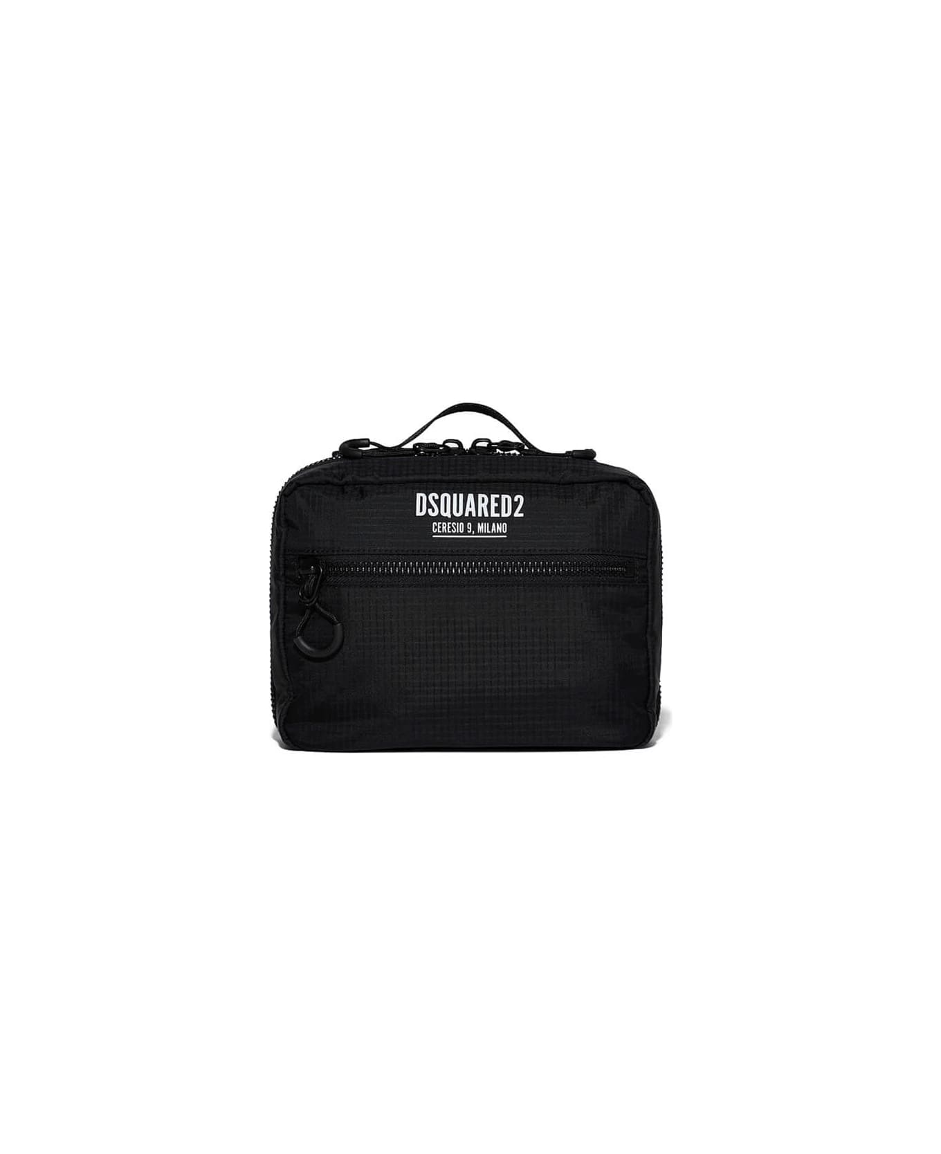 Dsquared2 Ceresio 9 handbag made of black ripstop nylon, decorated with contrasting printed logo on the front. External zip pocket, mesh interior with zip fastened pockets and top handle. Zip closure, measures 26x21x7. 5 cm.