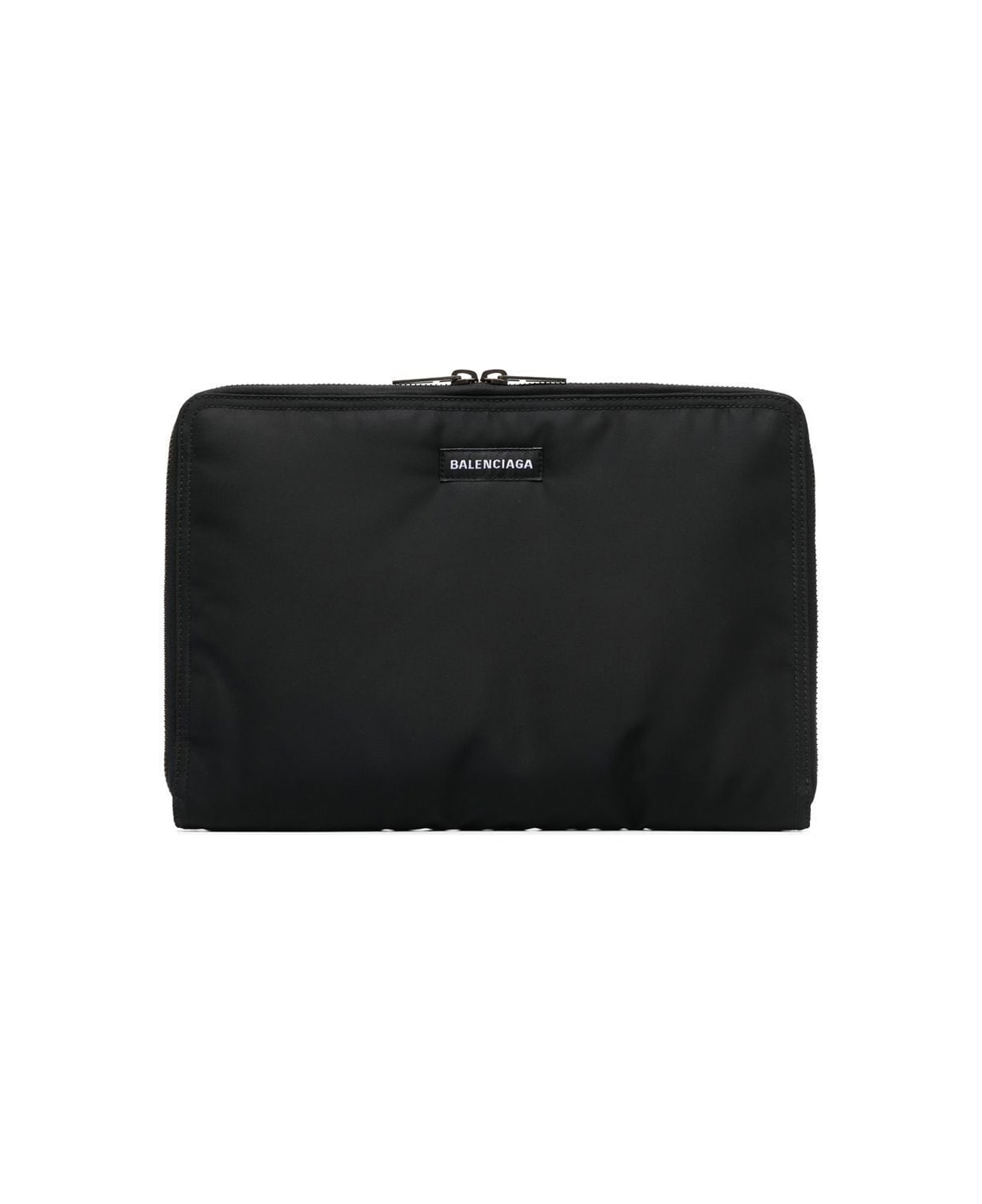 Balenciaga men's large Explorer clutch in black recycled nylon with white logo patch on the front and top closure with double-slider zip. Composition: 100% Polyamide