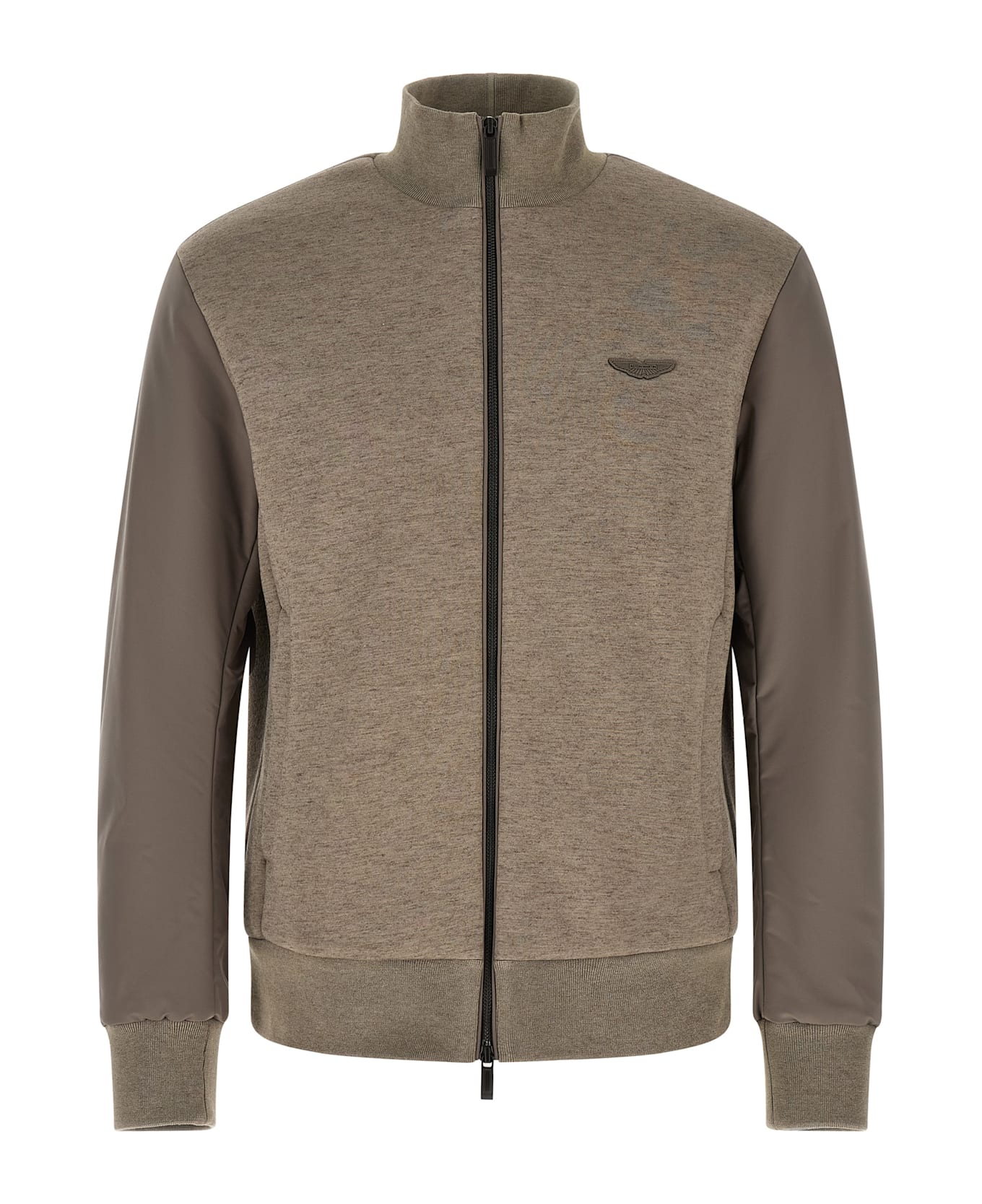 BOSS x Aston Martin 'Shepherd 242' bomber jacket in viscose and wool blend mélange with tone-on-tone nylon sleeves and stretch ribbed knit details, slightly padded nylon lining, logo patch and front zip closure, high neck, pockets, long cuffed sleeves, and headband.