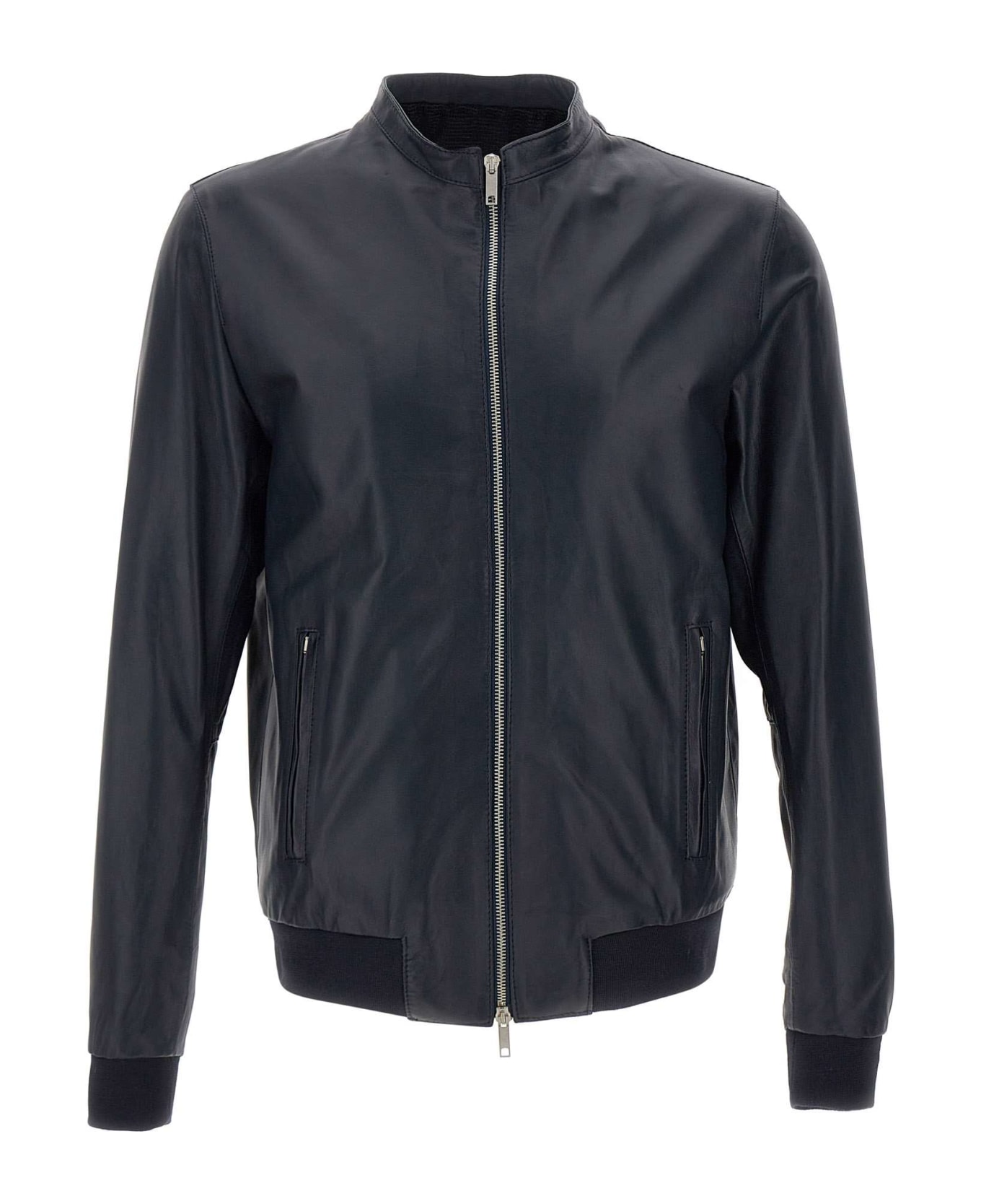 Mono "Art Lucky" men's jacket vegetable leather, dark blue, mandarin collar, front fastening with silver zip, inside pocket, two front pockets with vertical silver zip, elasticated ribbed hem and cuffs, ideal for a casual look in high low season. Made in Italy.