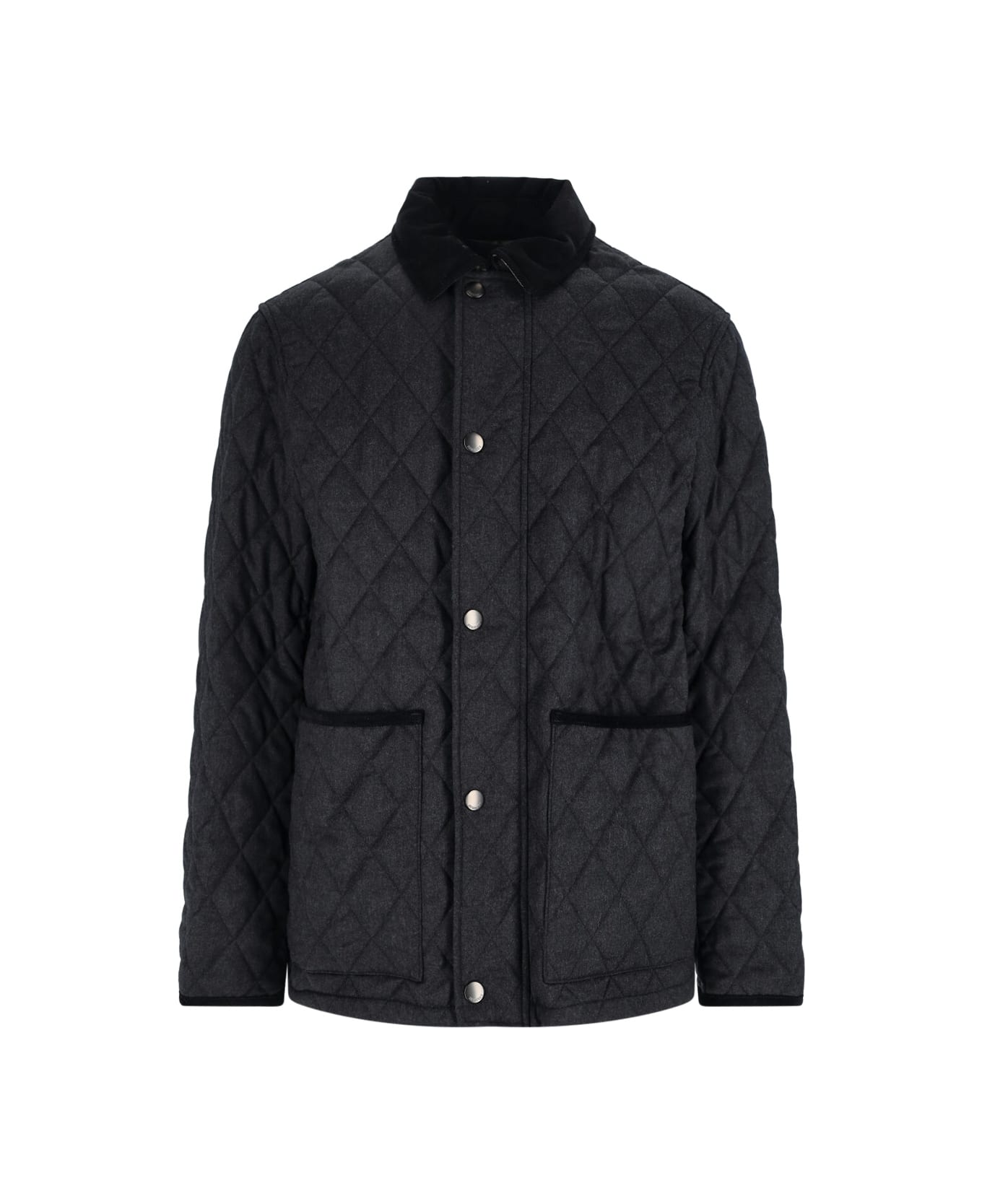 Burberry wool jacket in black nylon with padded and quilted design, classic corduroy collar, button and zip closure, two side flat pockets, side logo patch, straight hem. Composition: 100% Wool