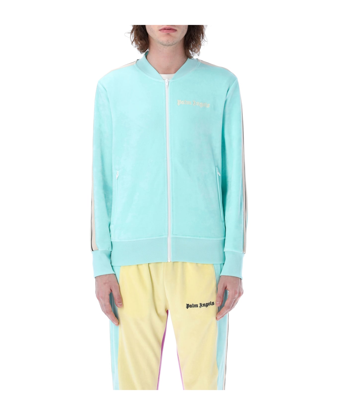 Chenille Bomber Track Jacket By Palm Angels. Featuring: Ribbed Collar Full Zip Fastening Zipped Pockets Palm Angels Embroidery At Left Chest Signature Band Along Sleeves Ribbed Cuffs Model Is 1,90 M Tall And He Is Wearing Size L