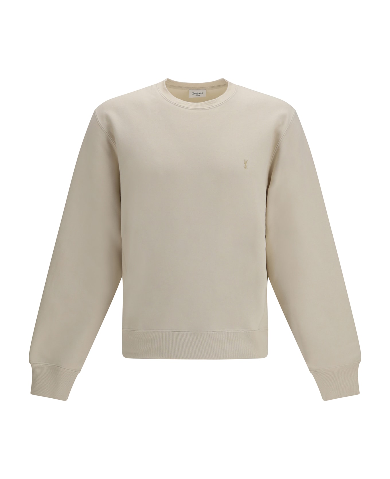 The sweatshirt with embroidered cassandre logo, crew neck and long sleeves by saint laurent expresses understated elegance through iconic detailing and clean lines. the front embroidery highlights the maison s identity with subtle refinement, while ribbed hem and cuffs shape the structure with balance and comfort. the streamlined construction enhances the silhouette naturally, making this sweatshirt by saint laurent a distinctive piece with refined character.