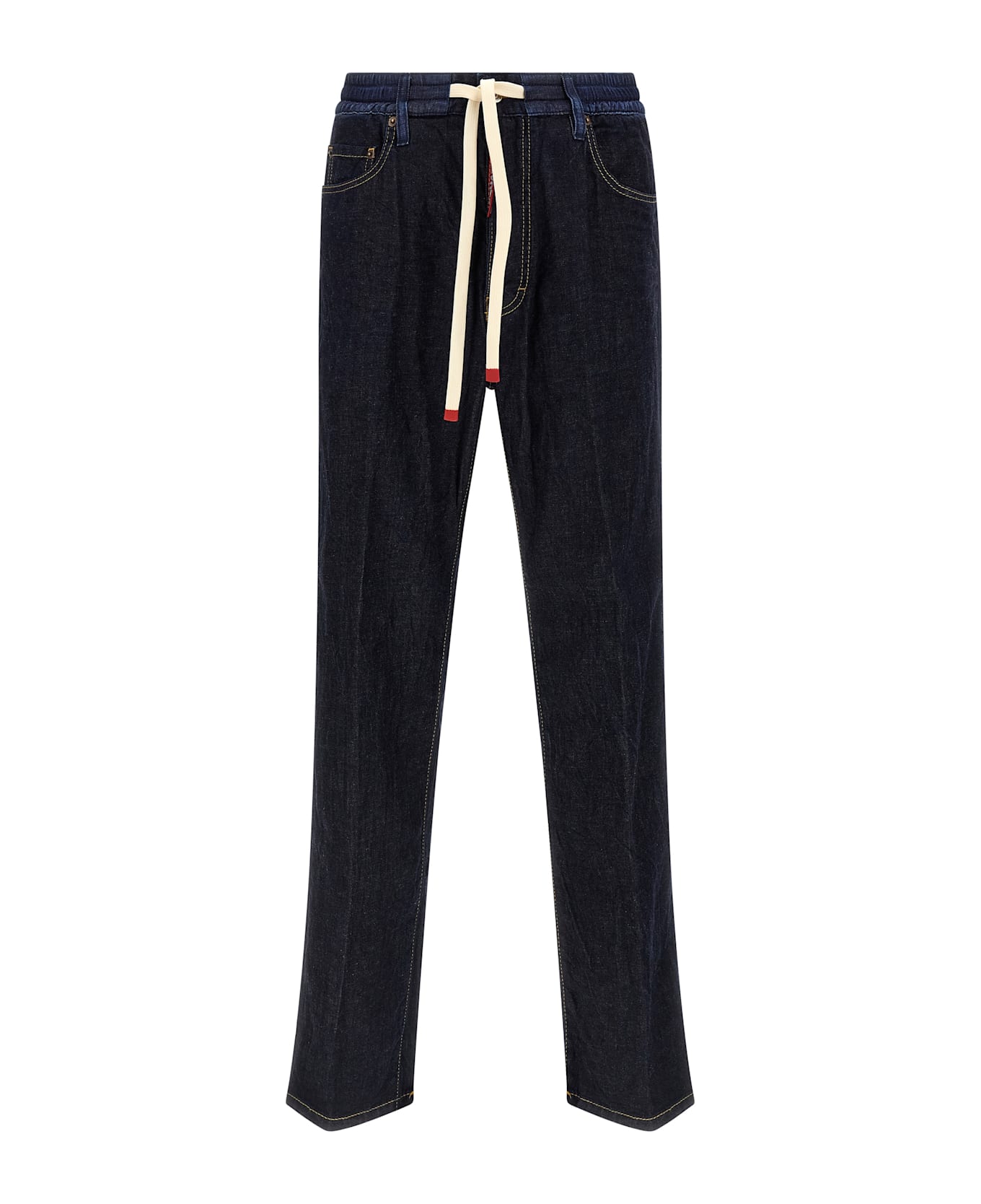 Crinkled cotton and hemp blend denim jeans, contrast stitching, straight leg, elastic trompe l'oeil and drawstring at the waist, front button closure, five pockets, and leather logo label at the back.