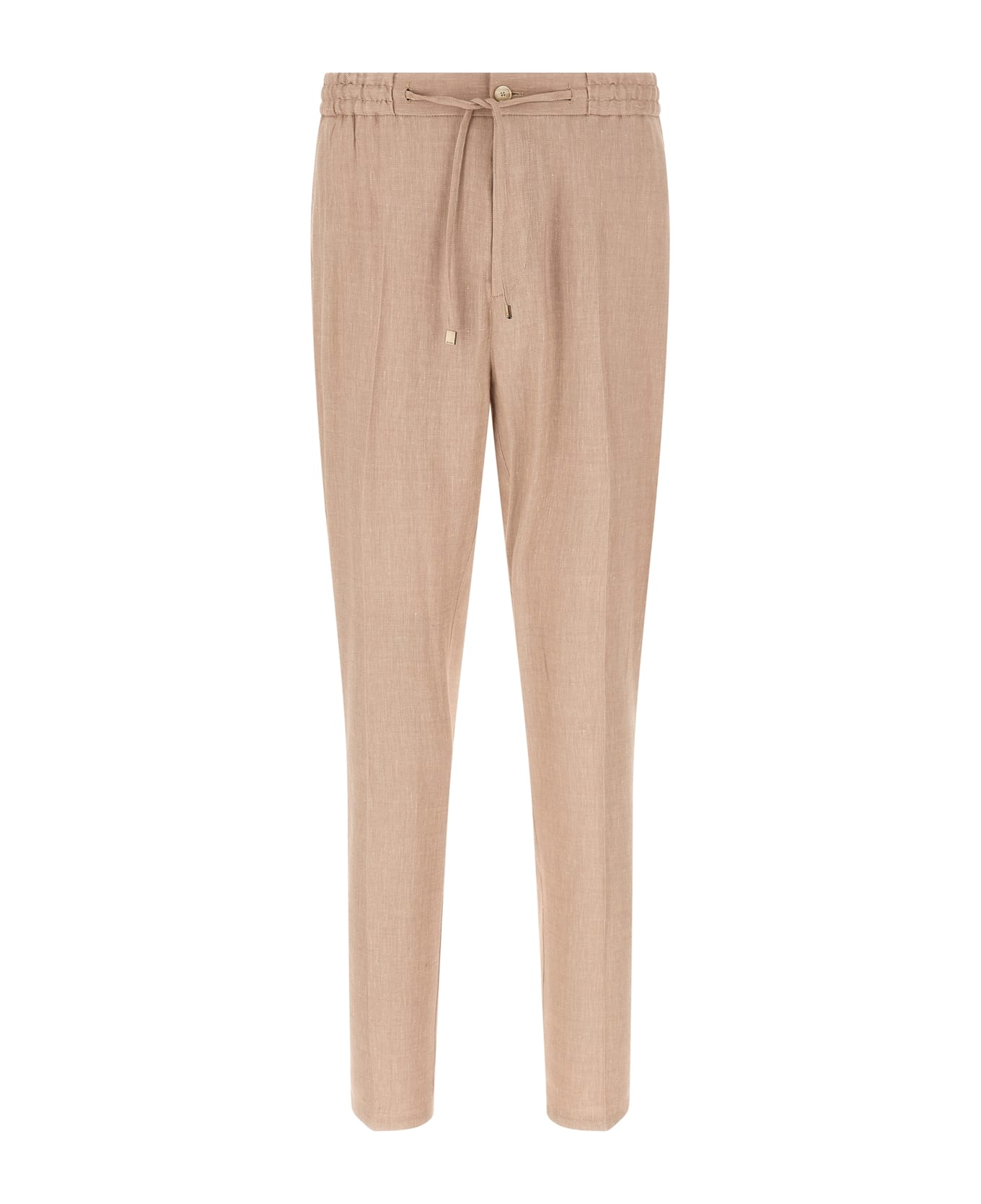 Joggers in flamed linen blend twill, straight leg, stretched pleat, drawstring elastic waistband, zip and front button closure, pockets. Composition: 53% li, 44% vi, 3% ea
